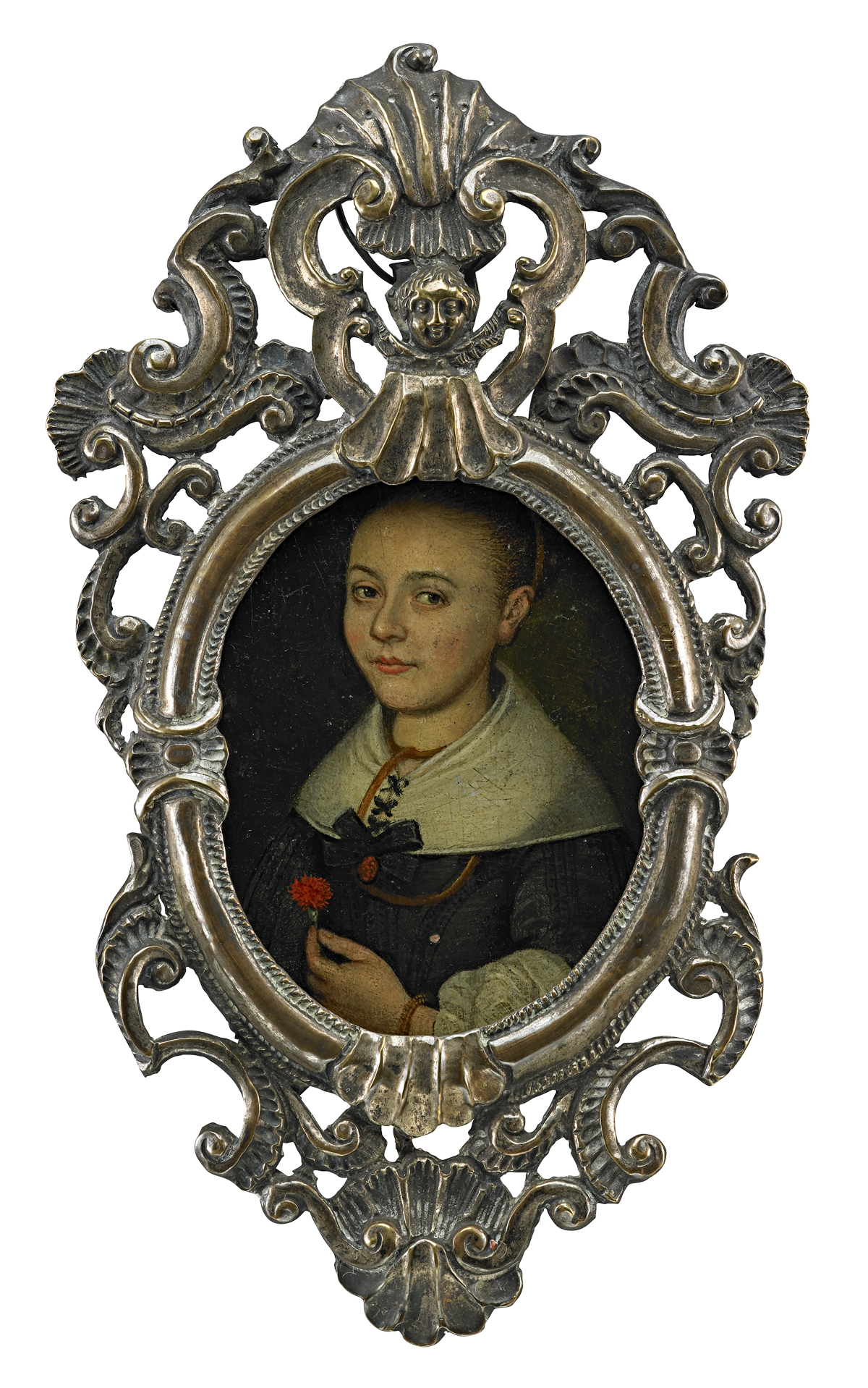 Im Barock entstand dieses Porträt eines jungen Mädchens in schwarzem Kleid mit weißem Spitzenkragen. Geschmückt hat sie sich mit Goldkette und Goldarmband. Sie trägt eine rote Nelke in der Hand, die als Mariensymbol gilt und für die Liebe steht.