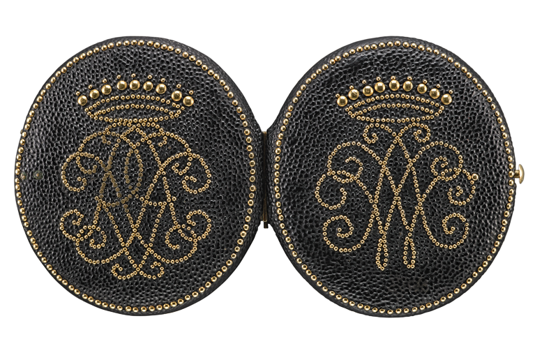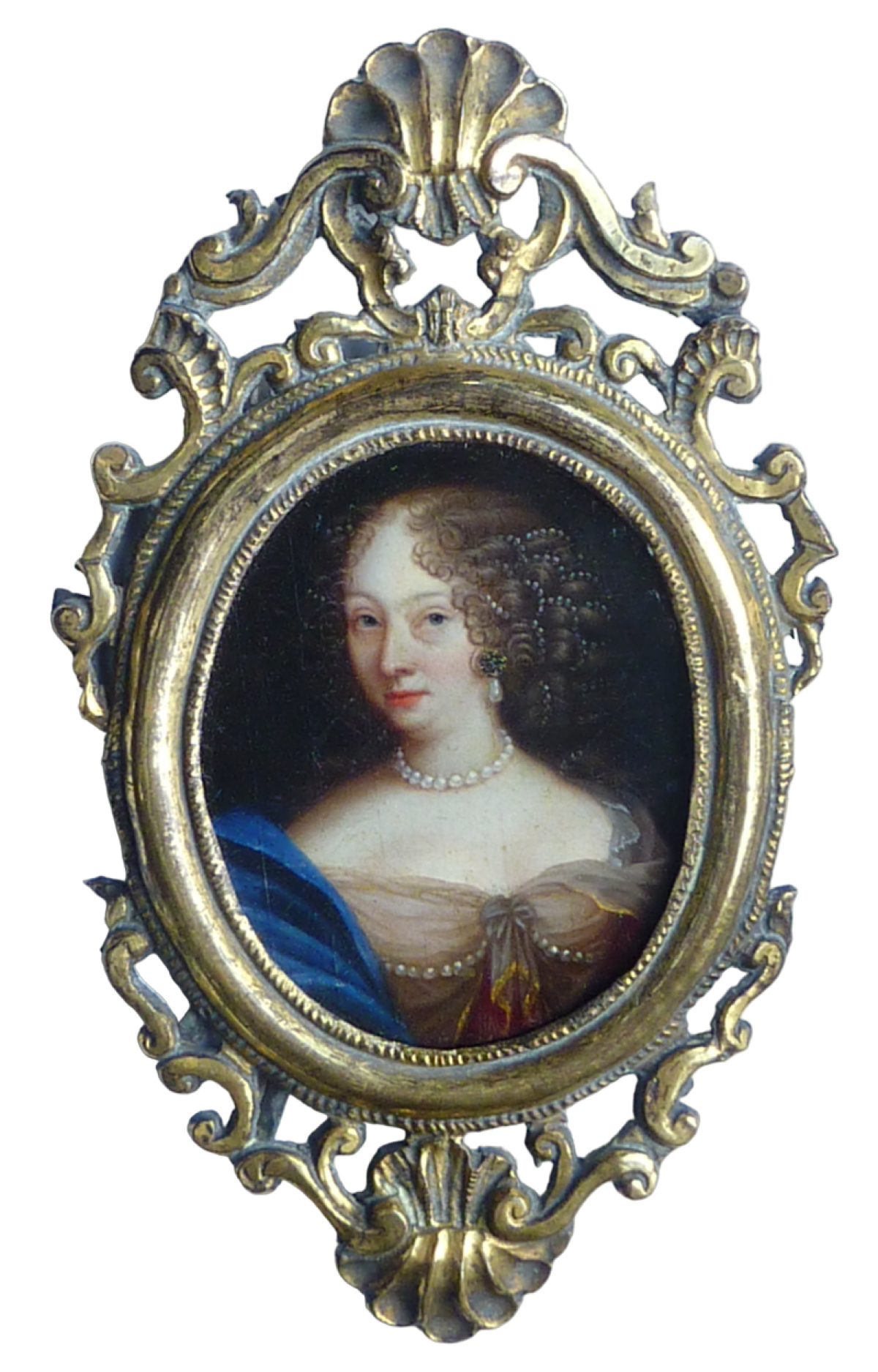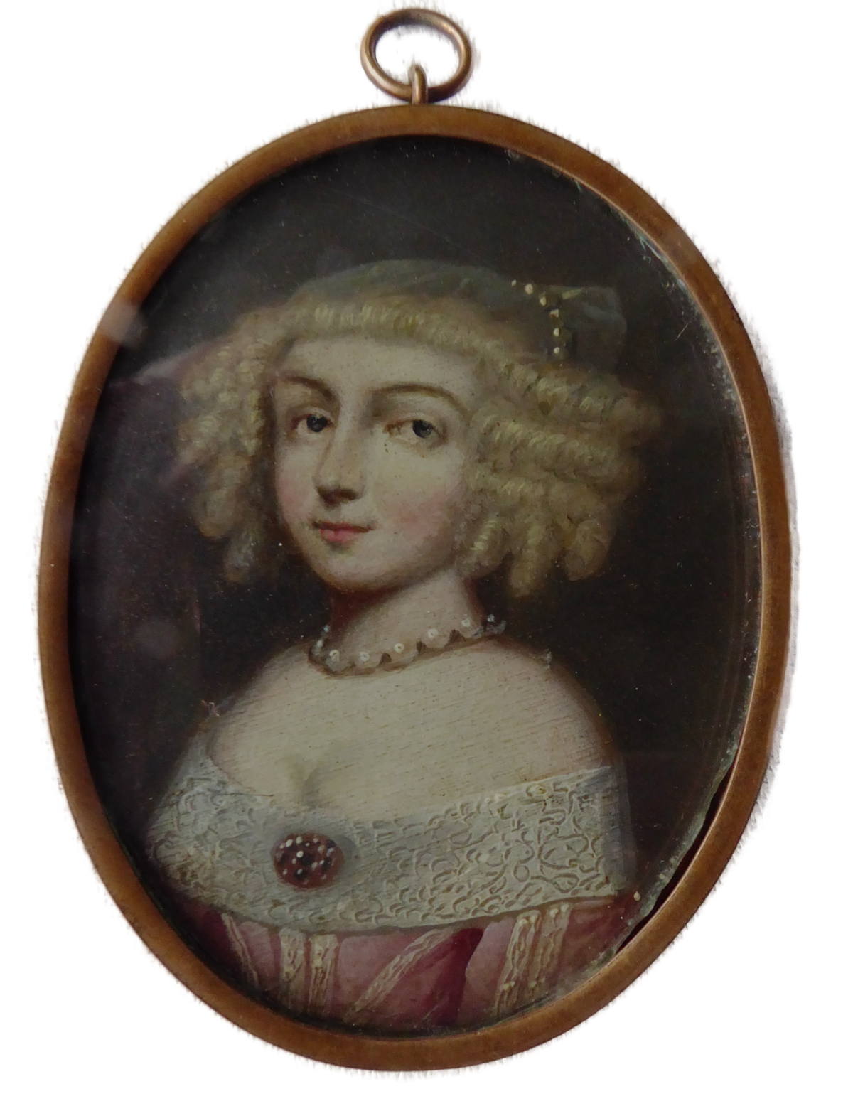 Dame in goldbesticktem Kleid, weißem Einsatz, blauem Mantel und Perlenschmuck. Originaletui mit Initialen und neunzackiger Adelskrone aus Gold-Piquée-Verzierungen. In die Tasche gesteckt, waren Miniaturen in Lederetuis besonders gut geschützt. Diese Art der „Rahmung“ war in allen Epochen beliebt und bewahrte die Werke vor Bestoßung und Licht. Als Leder verwendete man neben herkömmlichen, unterschiedlich gefärbten Sorten gerne auch Galuchat, das von der Haut von Fischen oder Reptilien stammte und dessen Musterung und Oberflächenstruktur faszinierten.