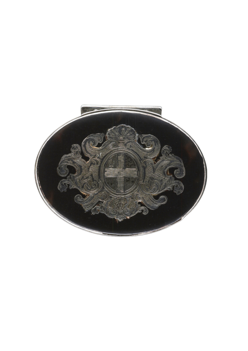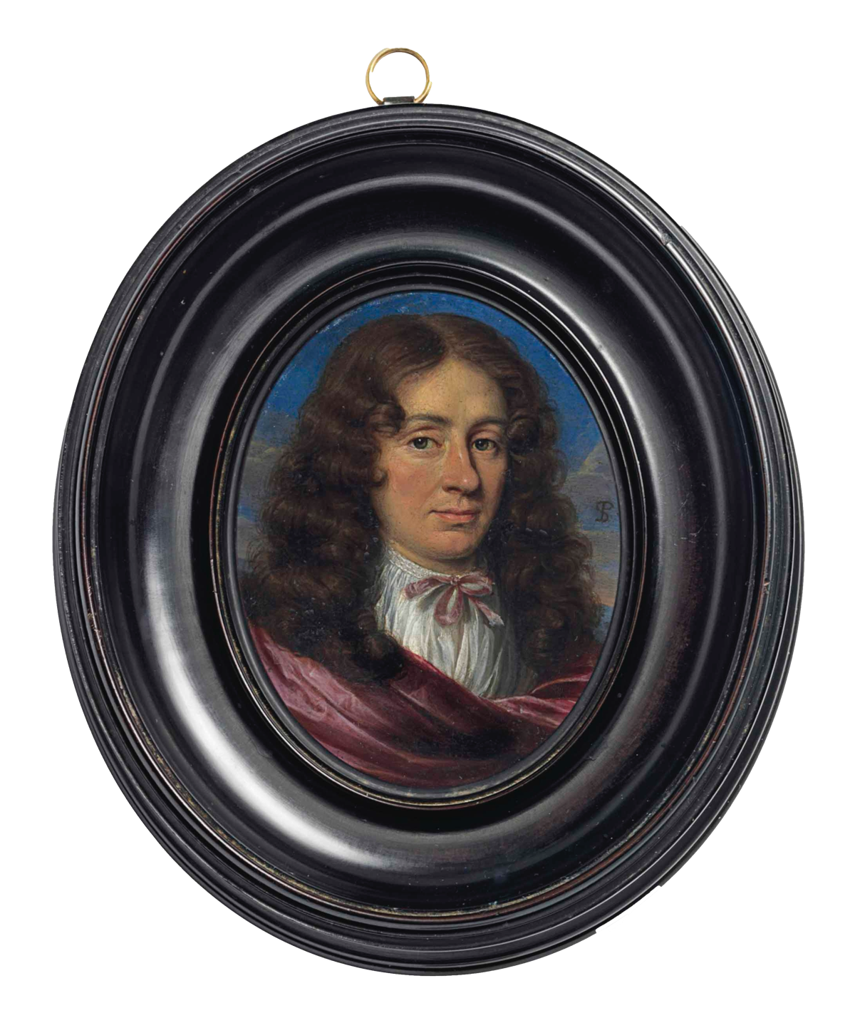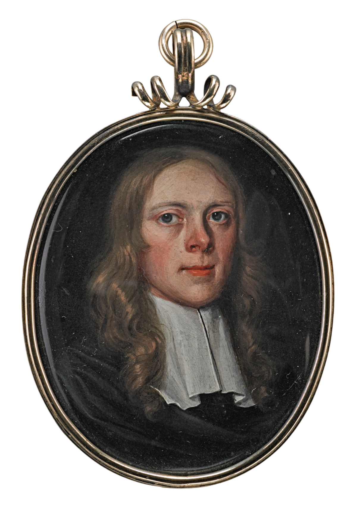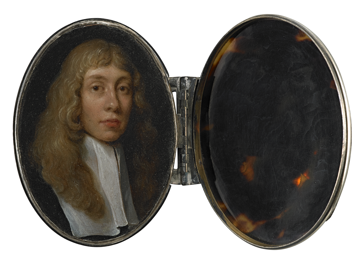 Porträt eines jungen Herrn, vermutlich Thomas Eccleston (1659 - 1743), in dunkler Jacke, Beffchen, lange Locken. Die Miniatur befindet sich auf einem Zwischendeckel einer Tabaksdose aus Schildpatt, deren Deckel mit dem Familienwappen der Eccleston‘s in Silber verziert ist.