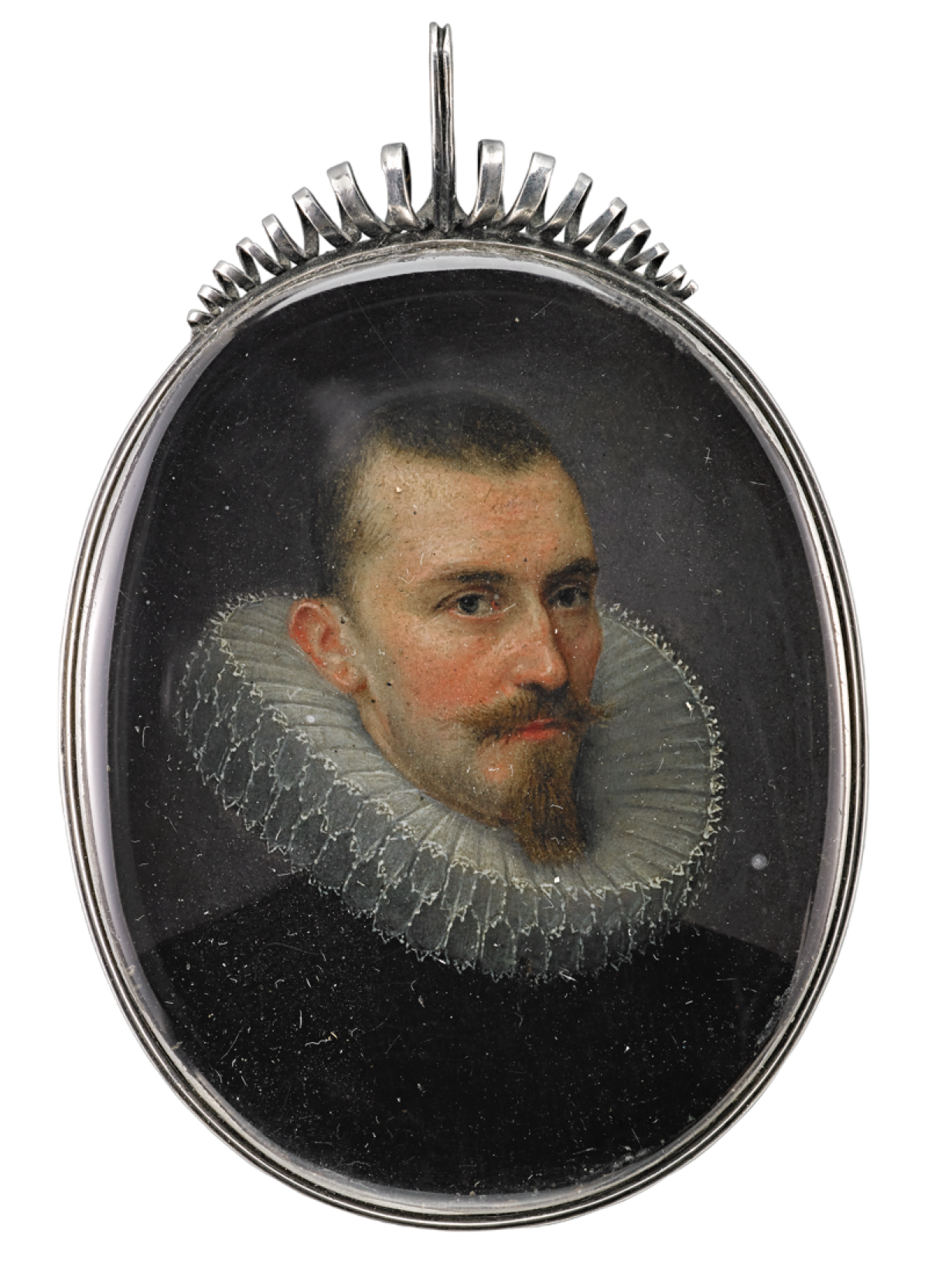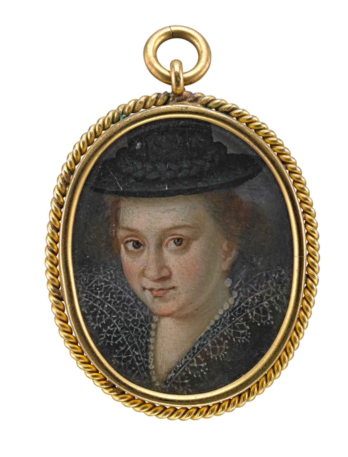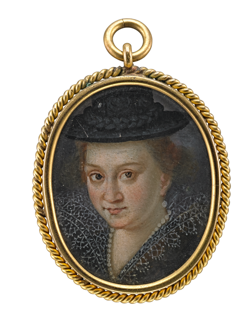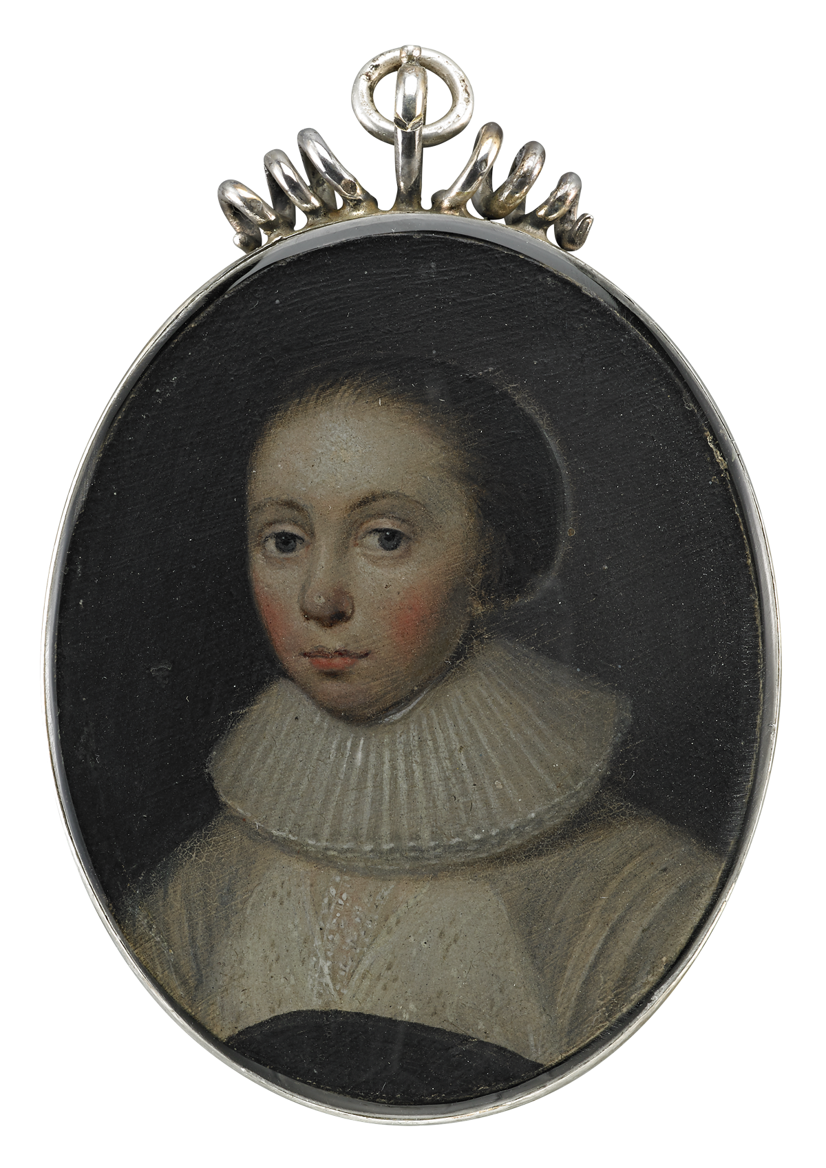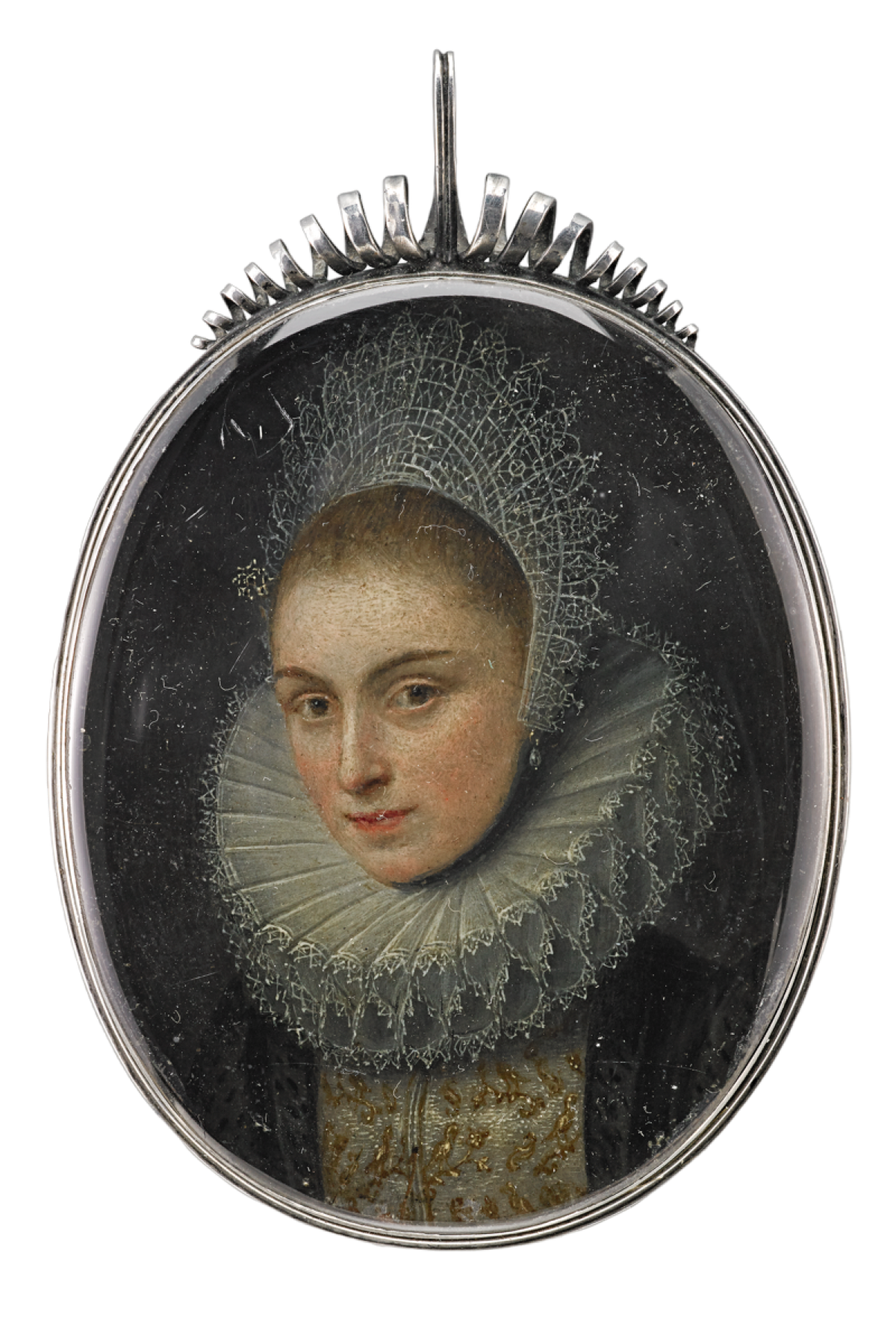Diese junge Dame malte er ca. 1628. Sie trägt ein schwarzes Kleid mit weißem Spitzenunterkleid und dazu eine Halskrause. Es gibt mindestens eine weitere Version dieser Miniatur.
