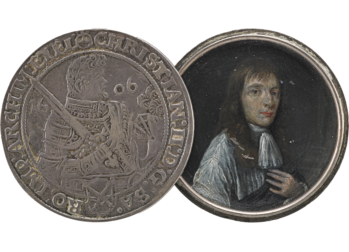 Schraub-Thaler mit Porträt eines Herrn in weißem Hemd und Schleife. Vorderseite der Silbermünze mit dem Porträt Christian II aus dem Jahr 1606: RO:IMP:ARCHIM:ETEL CHRISTRIAN:II:D:SA Rückseite der Münze: INF.HISPA.ARCHIDVX.AVSTRIEDVS.BVRG