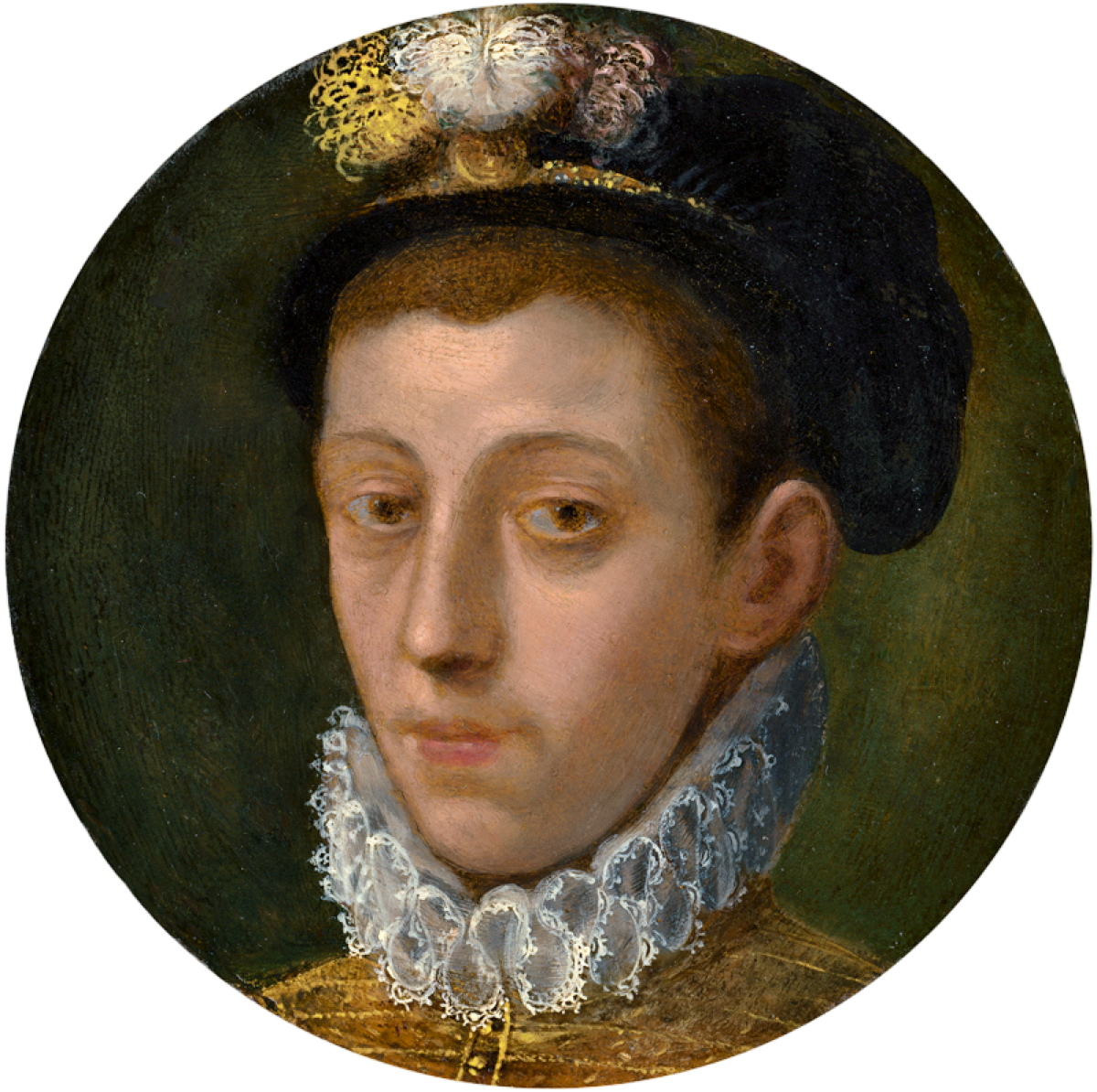 Dieser junge Mann mit Halskrause und Barett mit Federn wurde auf Holz gemalt.