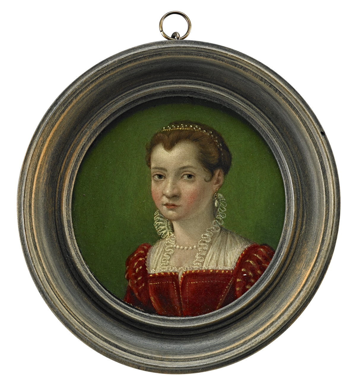 Diese junge Italienerin in rotem Kleid mit weißem Einsatz und Spitze wurde Ende des 16. Jahrhundert gemalt. Der damaligen Mode entsprechend trägt sie ein Perlendiadem und Perlenohrringe.