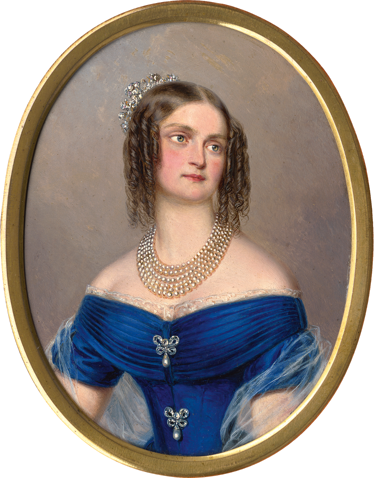Auf dieser Miniatur von 1835/ 40 trägt sie ein blaues Kleid mit weißem Schleier, dazu reichen Perlenschmuck und ein Diamantendiadem.