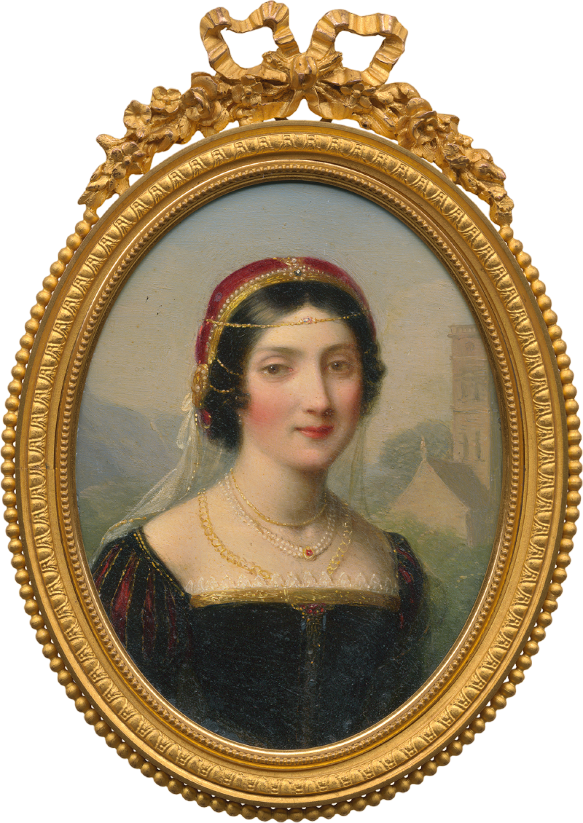 Die junge Dame präsentiert sich hier im „Style Troubadour“. Sie trägt zum dunklen Samtkleid mit gestreiften Ärmeln eine rote Haube und reichen Schmuck. Im Hintergrund sieht man eine Landschaft mit Kirche.
