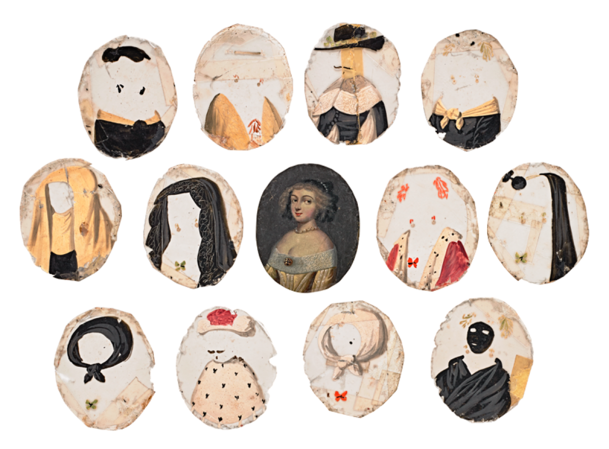 Wahrscheinlich gehörten ursprünglich zu dieser Ölminiatur auf Kupfer Glimmerplättchen mit verschiedensten Kostümen.