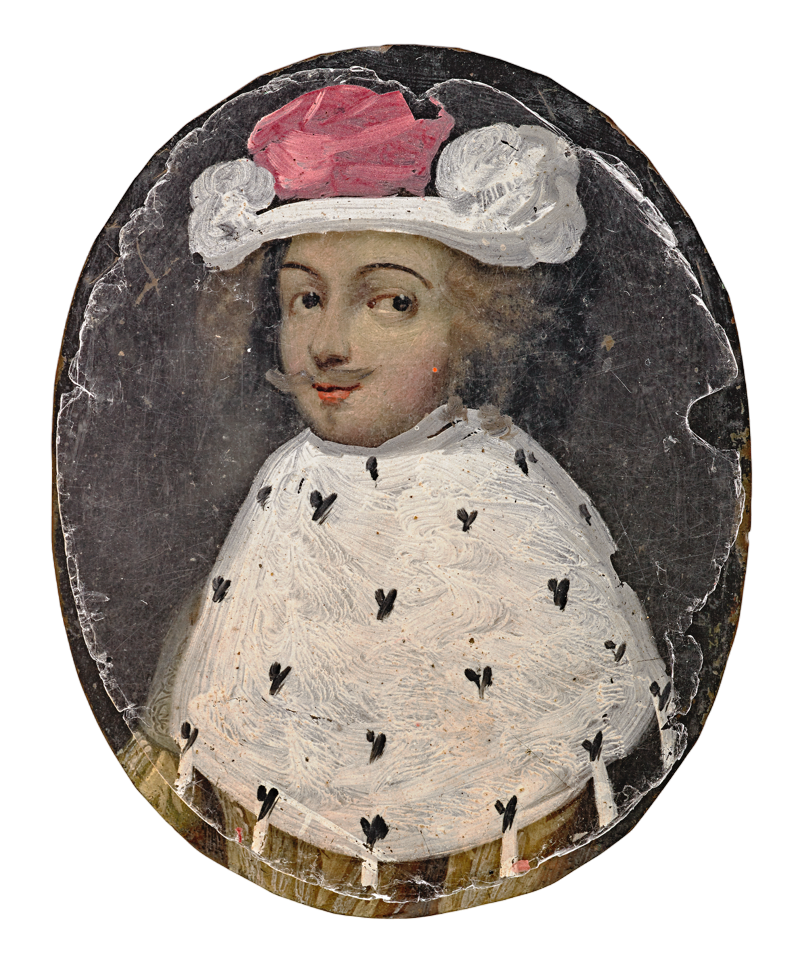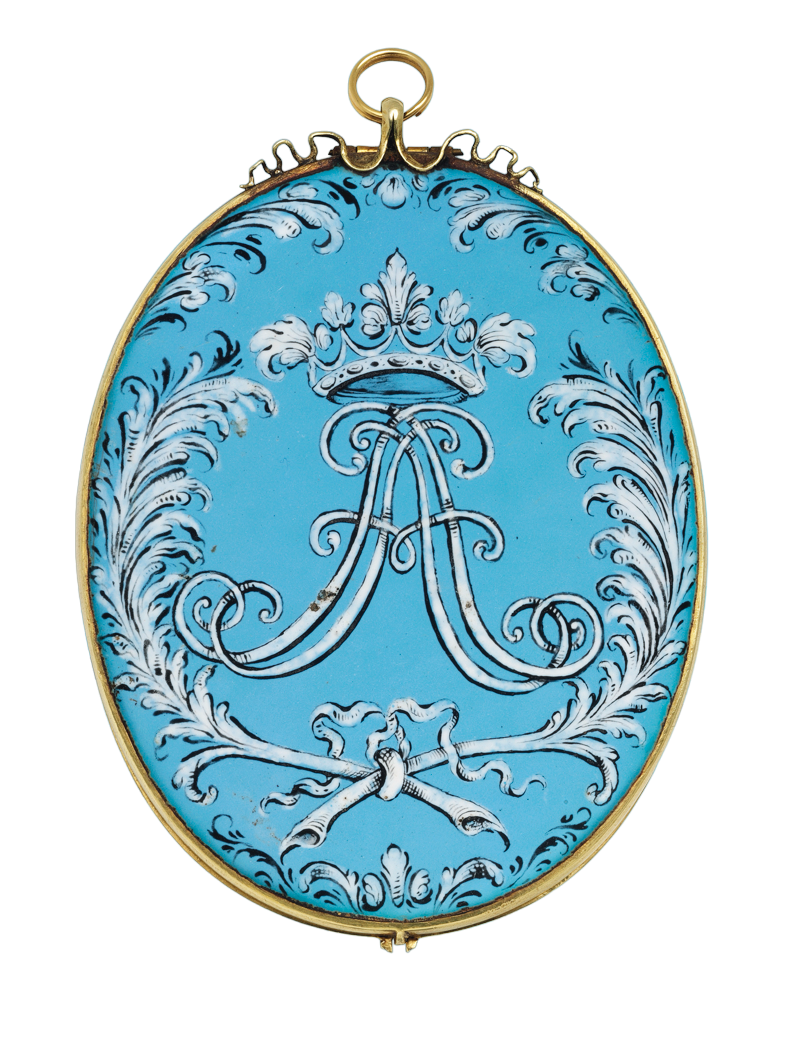 Dieser stattliche Herr trägt Rüstung, Spitzenjabot und eine lange lockige Perücke. Interessant ist die Rückseite aus blau-weißer Emaille mit einem Monogramm unter einer Krone