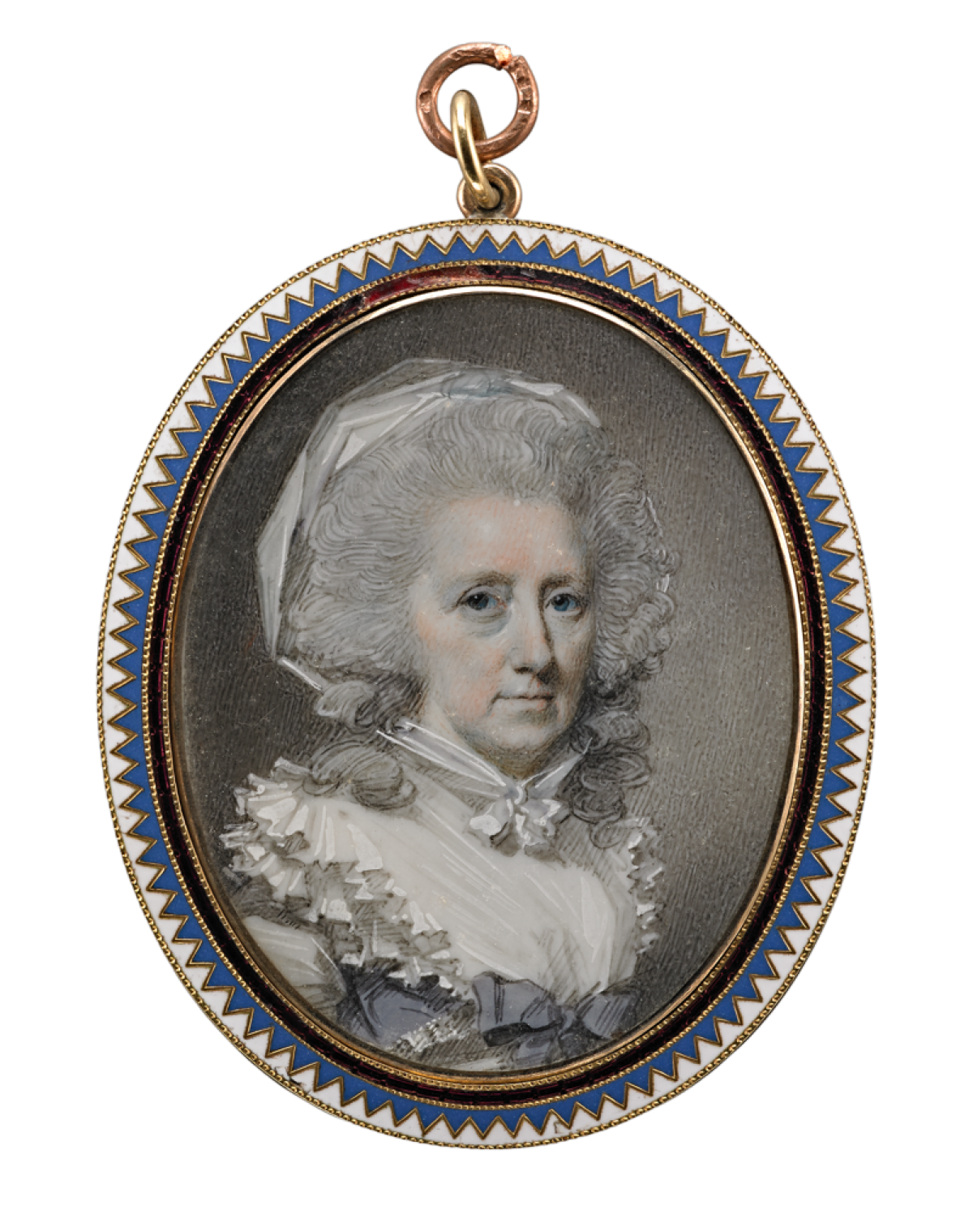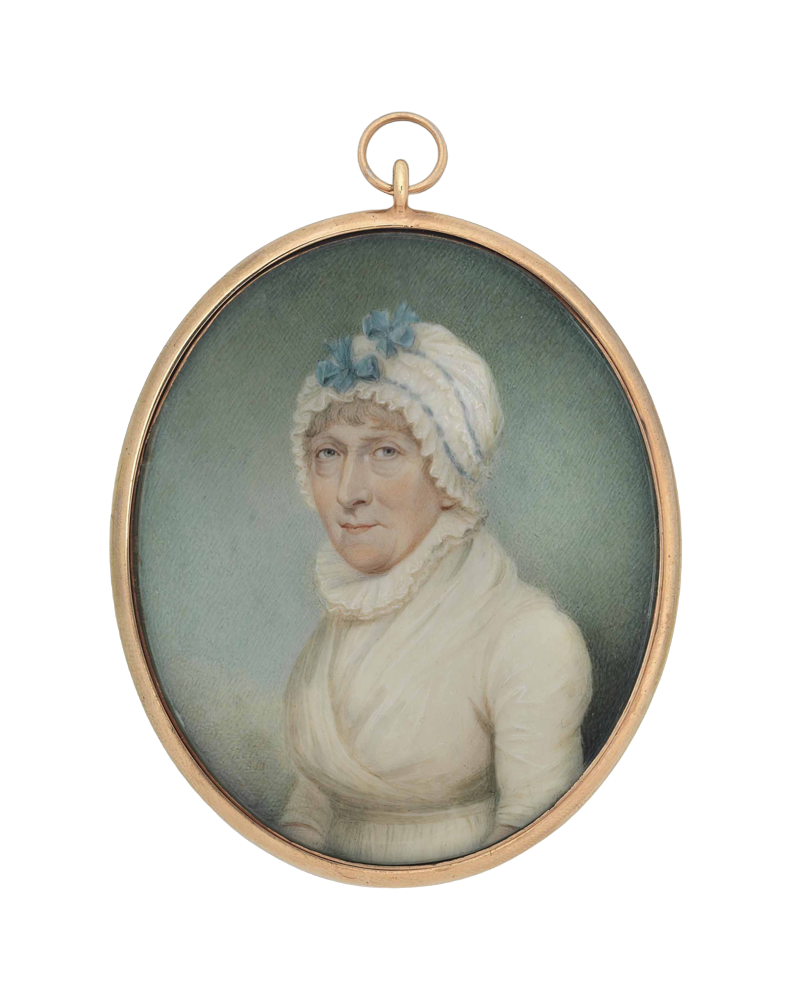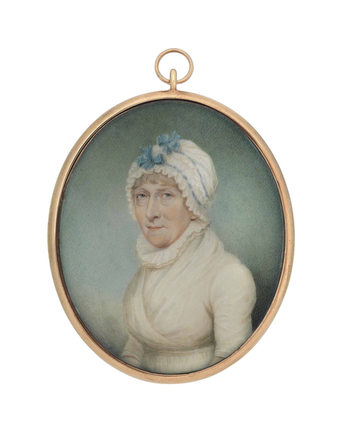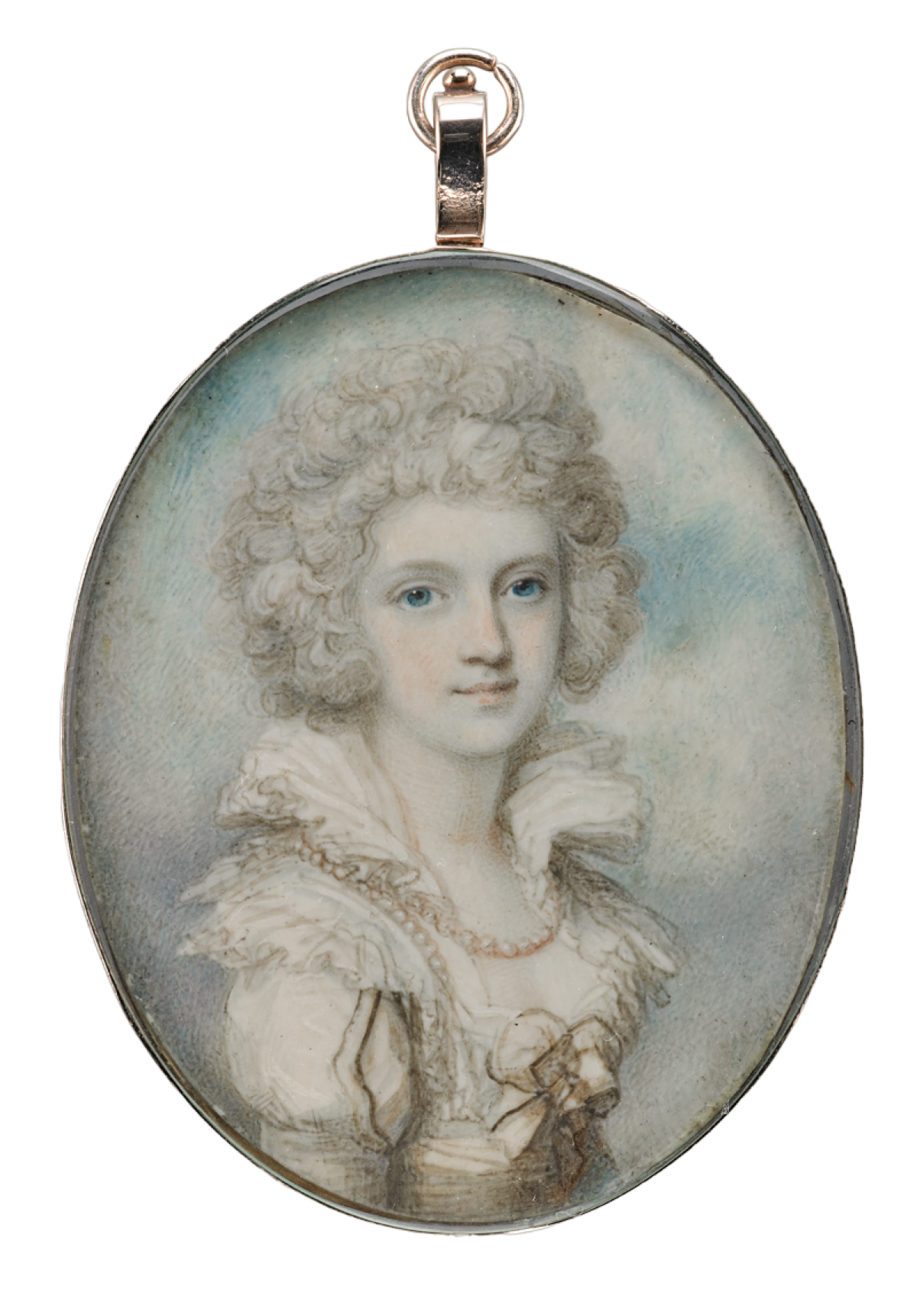 signiert und datiert 1791. Diese Dame trägt ein blaues Kleid mit weißem Einsatz, dazu ein weißes Tuch im gepuderten Haar. Der irische Maler hat große Flächen des Elfenbein-Malgrundes nur sehr dünn mit Wasserfarbe laviert. Er war bekannt dafür, dass er nur wenige farbige Akzente gesetzt hat.