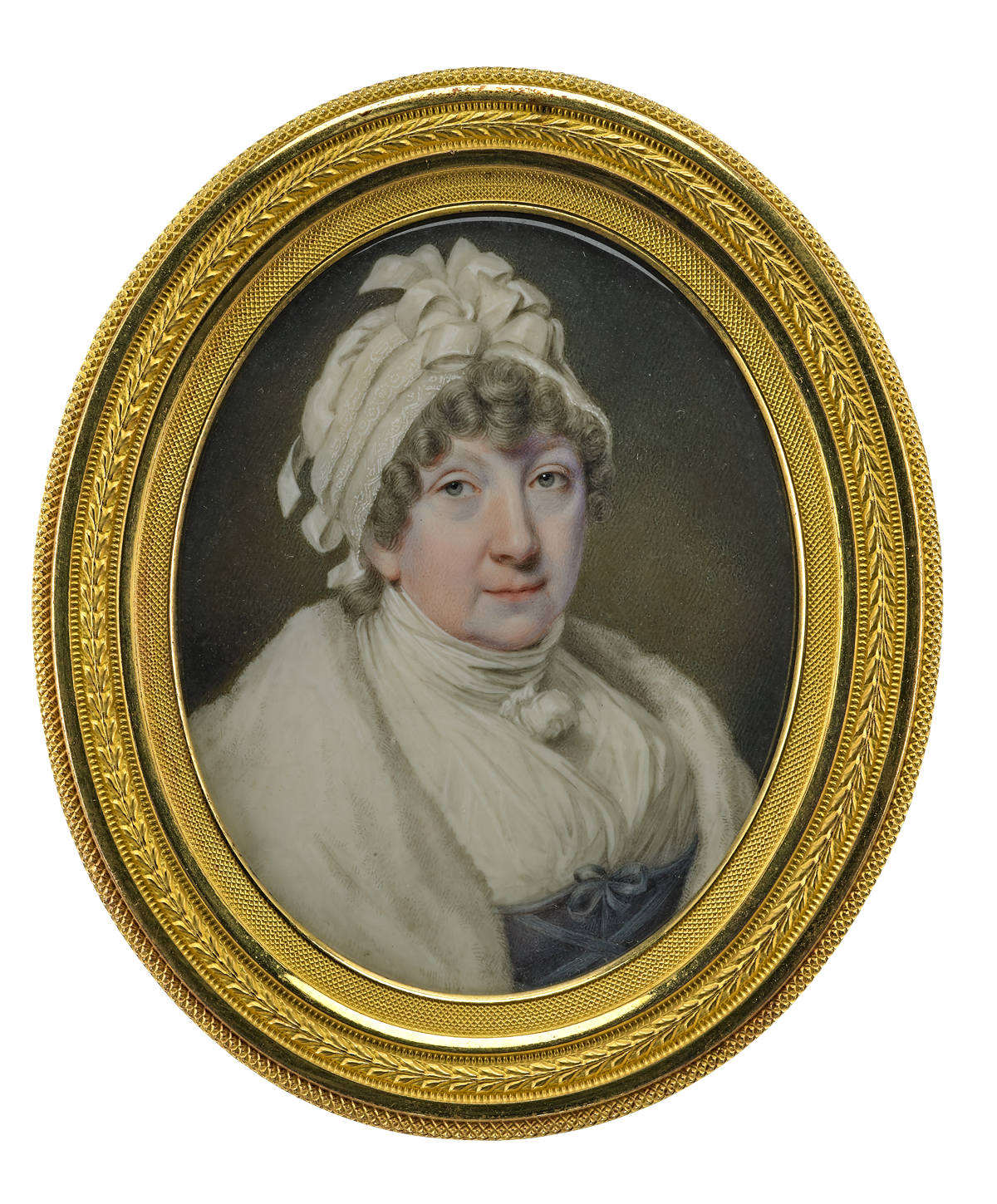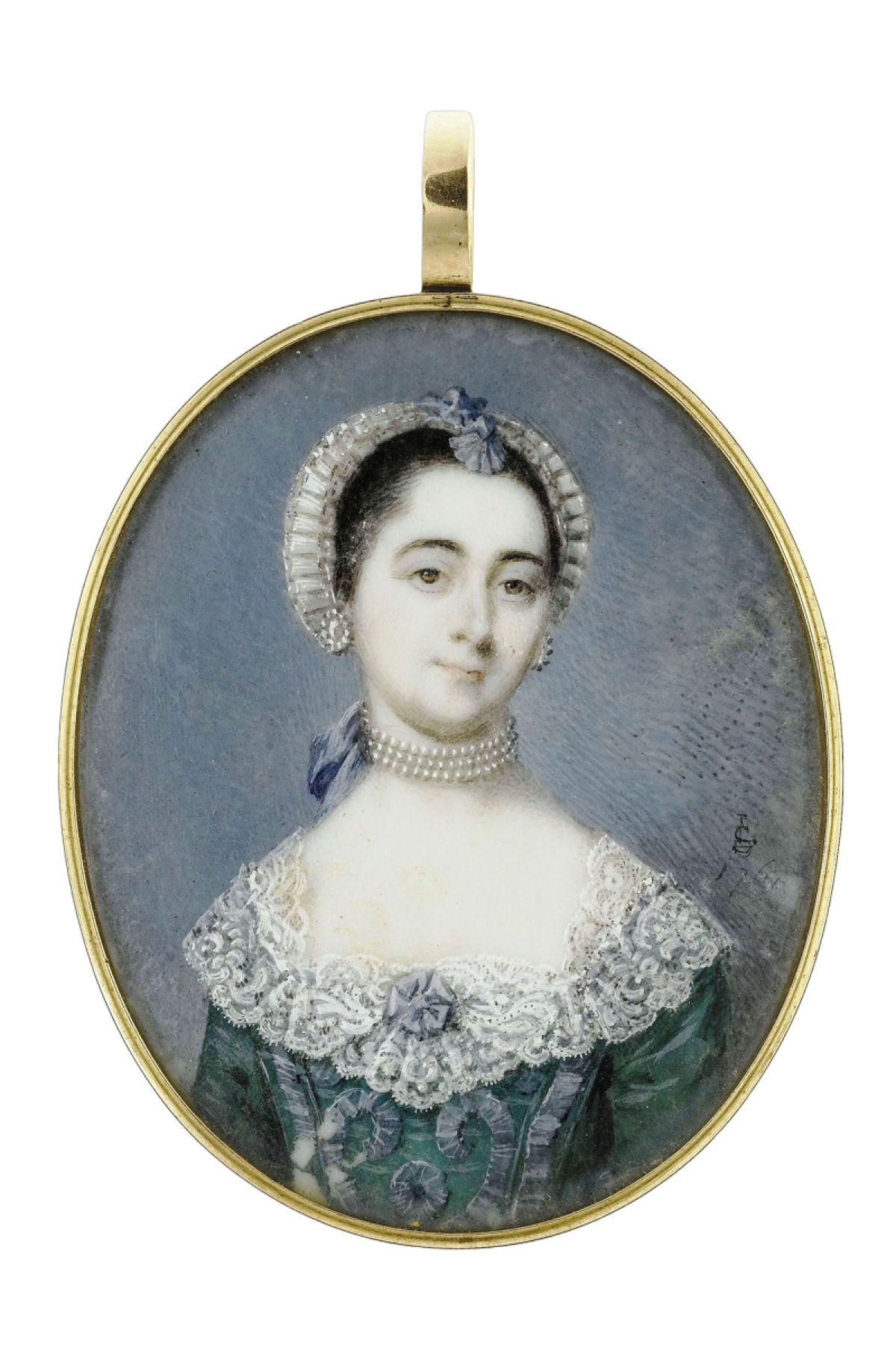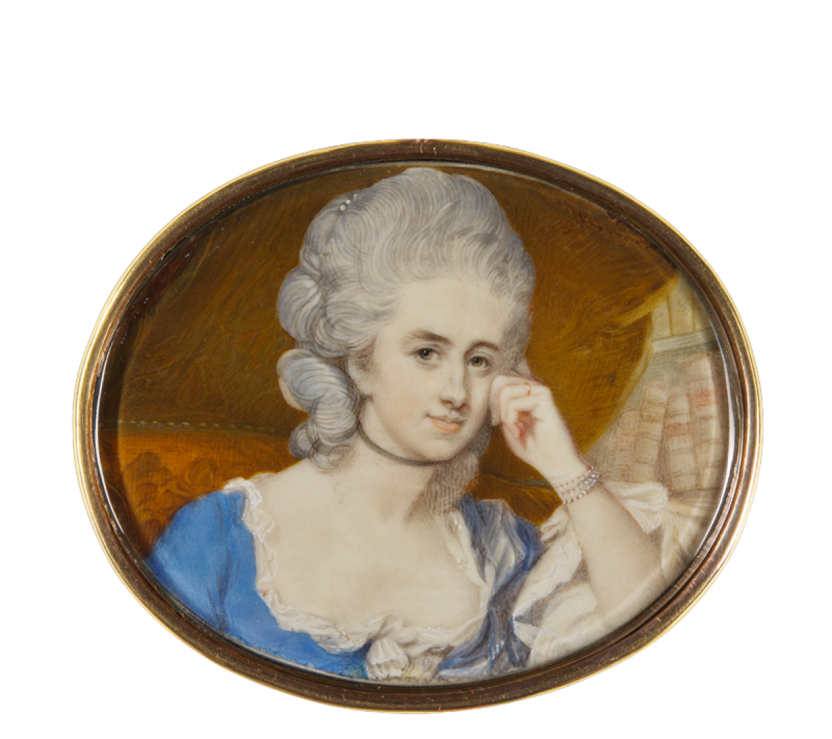 signiert und datiert 1791. Diese Dame trägt ein blaues Kleid mit weißem Einsatz, dazu ein weißes Tuch im gepuderten Haar. Der irische Maler hat große Flächen des Elfenbein-Malgrundes nur sehr dünn mit Wasserfarbe laviert. Er war bekannt dafür, dass er nur wenige farbige Akzente gesetzt hat.