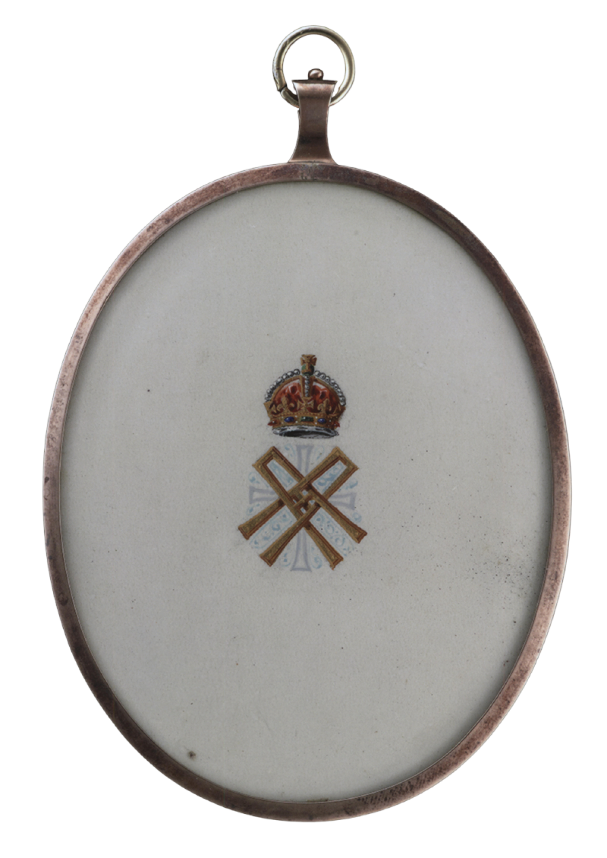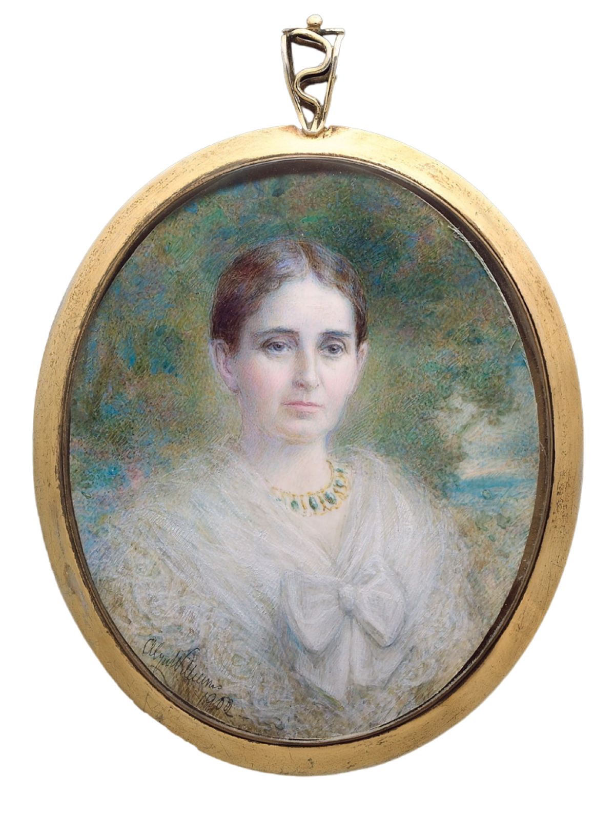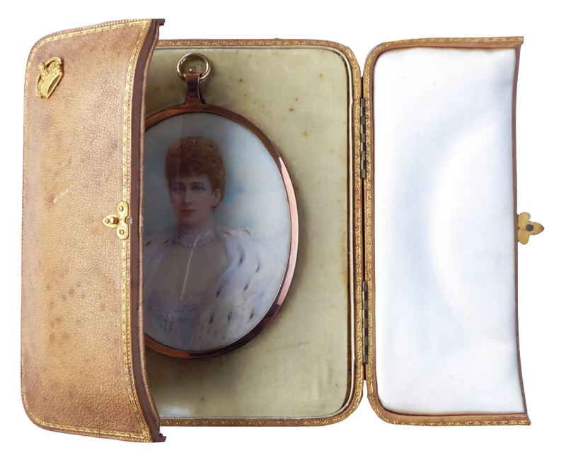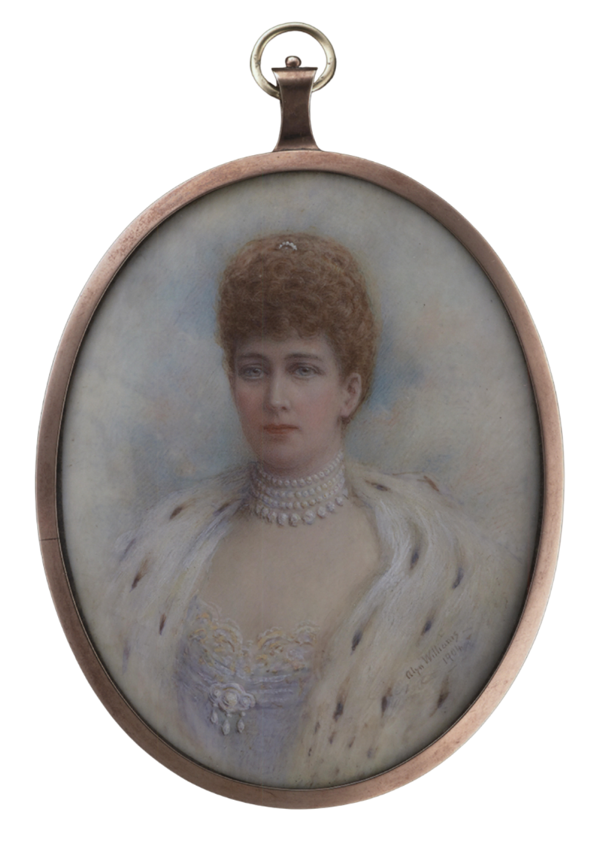 unten rechts signiert & datiert 1904 Anlässlich des 60. Geburtstages von Queen Alexandra of England hat Williams dieses Porträt in mehreren Versionen angefertigt. Es wurde in einer Lederschatulle mit Krone verschenkt. Auf der Rückseite finden wir zwei verschlungene „A“ für Alexandra und Albert, dem späteren König Edward VII. Höhe 95 mm