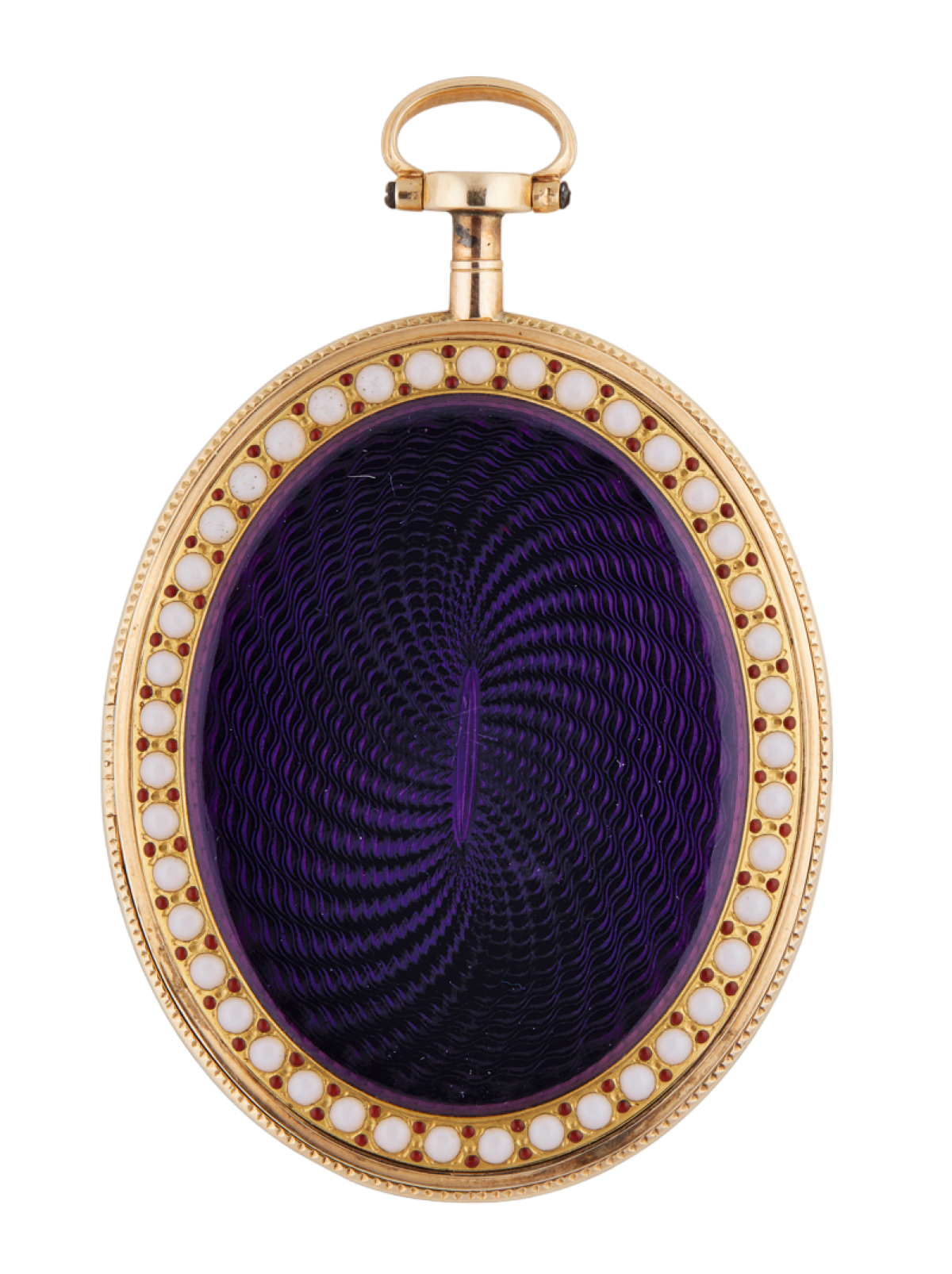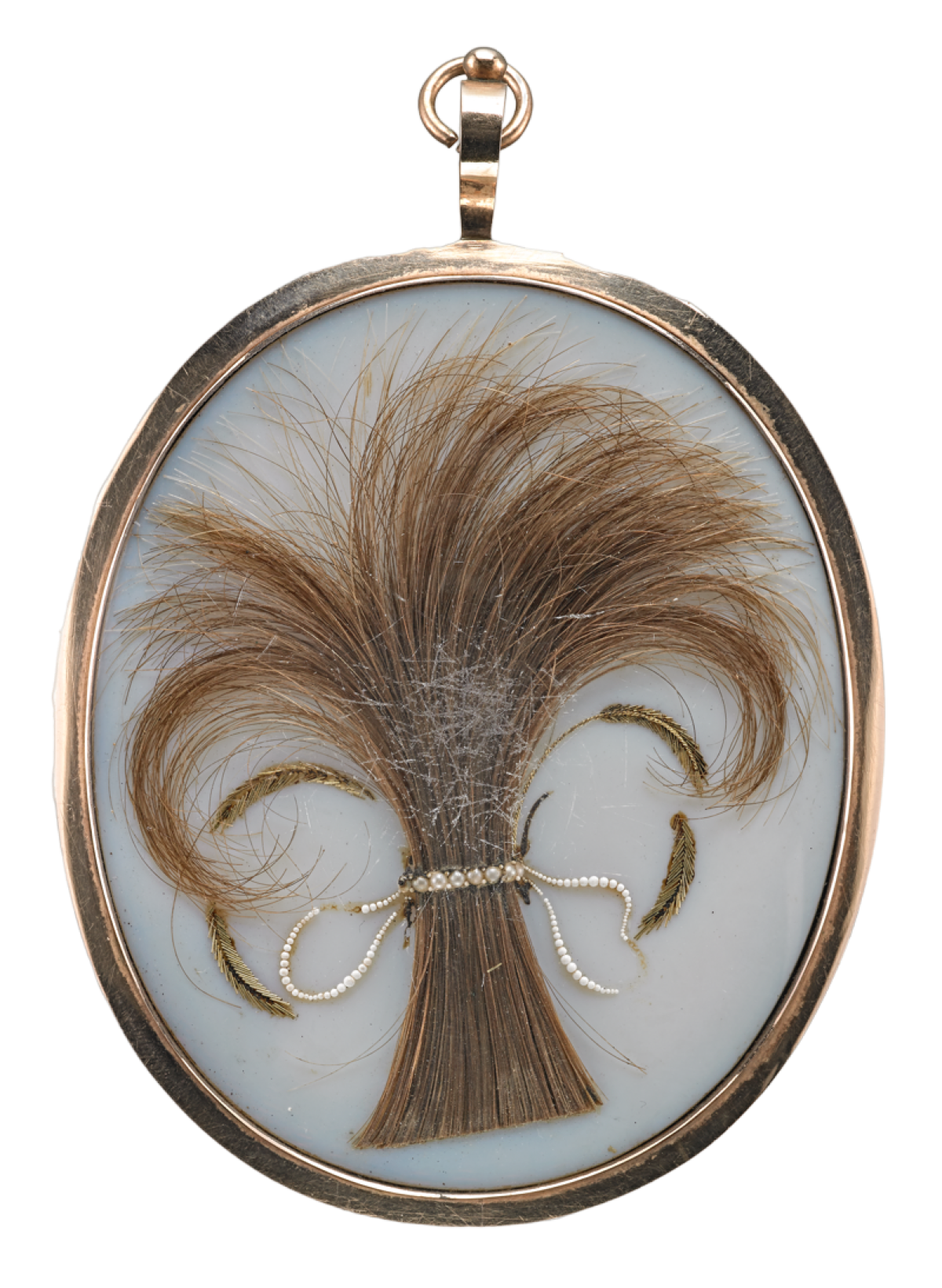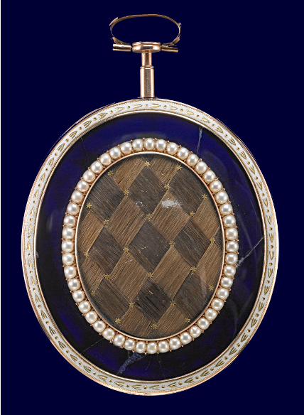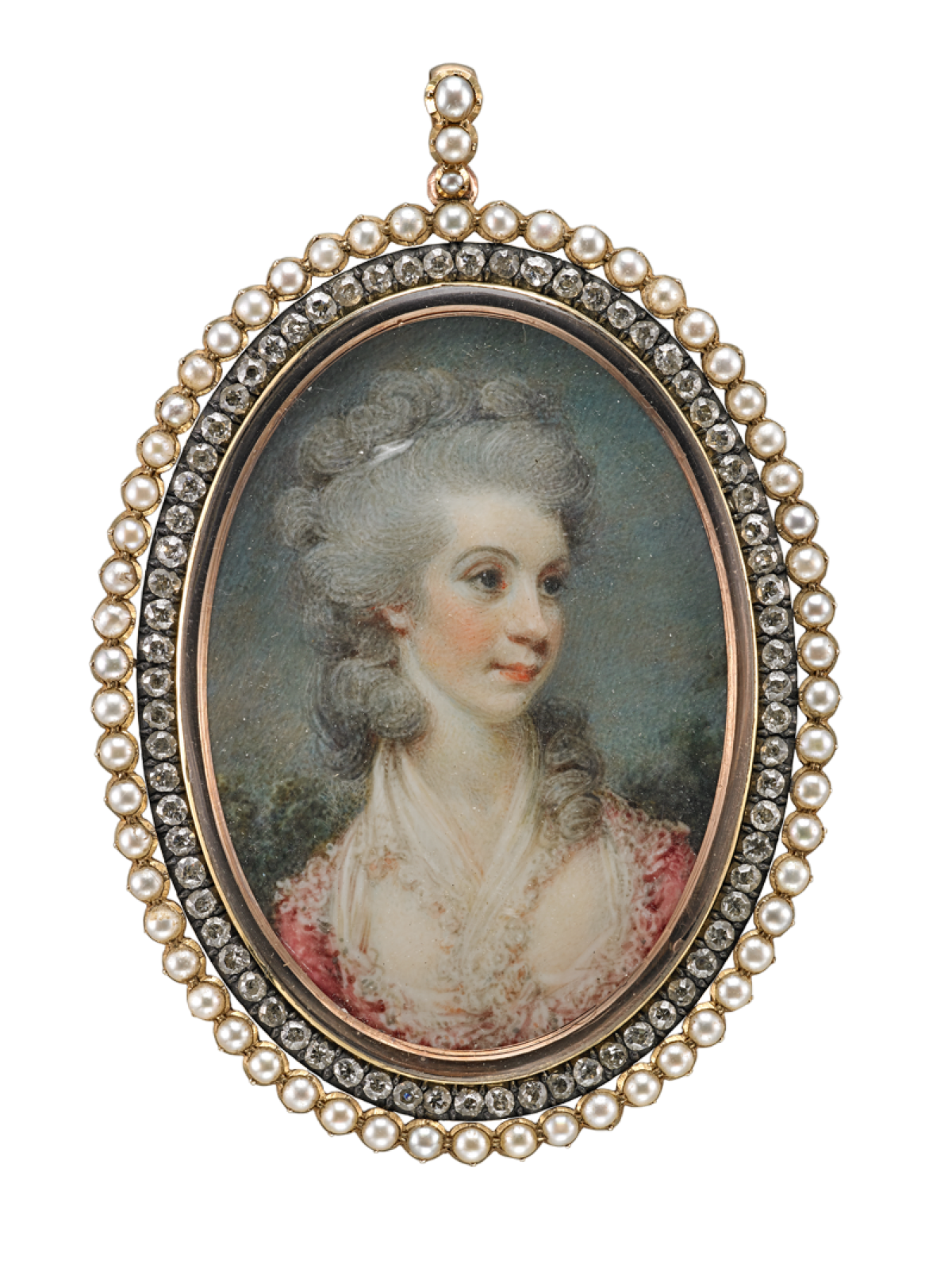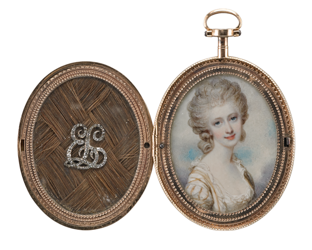Besonders aufwändig gerahmt ist dieses etwa 1780 von Richard Cosway gemalte Porträt einer Jungen Dame in weißem Kleid mit goldenen Streifen. Seine flotte, luftige Malweise ist hier gut zu erkennen. Die Außenseiten des Medaillons sind mit guillochierter Emaille und Perlen verziert. Innen sehen wir die Initialen der Dame „EL“ auf ihren geflochten Haaren.