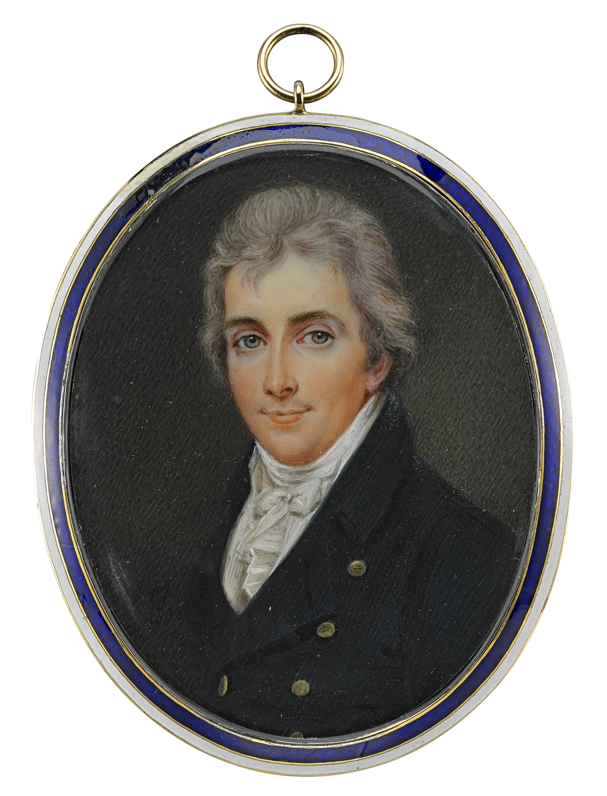 Der einzige Sohn des berühmten John Smart hat ebenfalls Porträtminiaturen gemalt. Wie sein Vater zuvor, ging er 1809 nach Indien, starb aber dort schon drei Monate nach seiner Ankunft. Dieses Bild von 1808, signiert JSJ, wurde noch in England gemalt. Es zeigt Peniston Lamb (1770 – 1805) in dunkelblauer Jacke mit weißem Jabot.