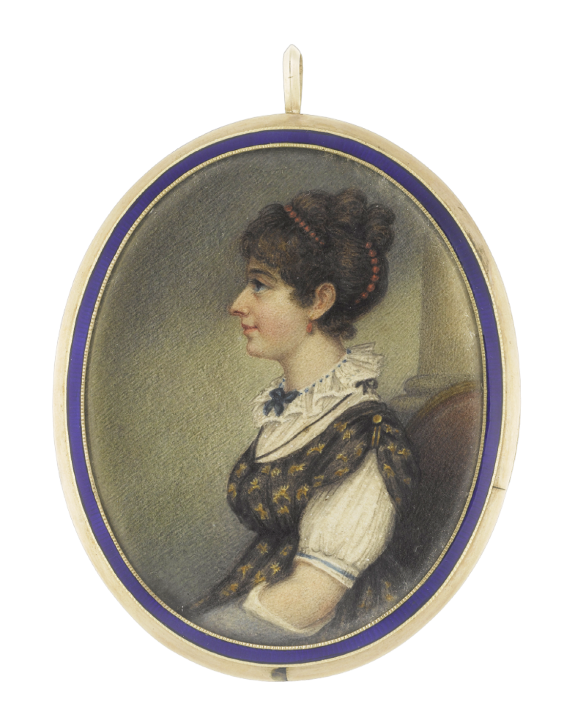 Der Ire Adam Buck kam aus einer Familie von Silberschmieden und spezialisierte sich schon früh als Miniaturmaler. In London erwarb er sich schnell die Gunst des Prinzen von Wales und des Herzogs von York. Hier ist Lady Pereley im Profil vor einer Steinsäule in gemustertem Kleid und Korallenschmuck im Haar dargestellt.