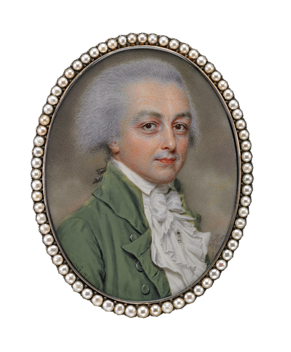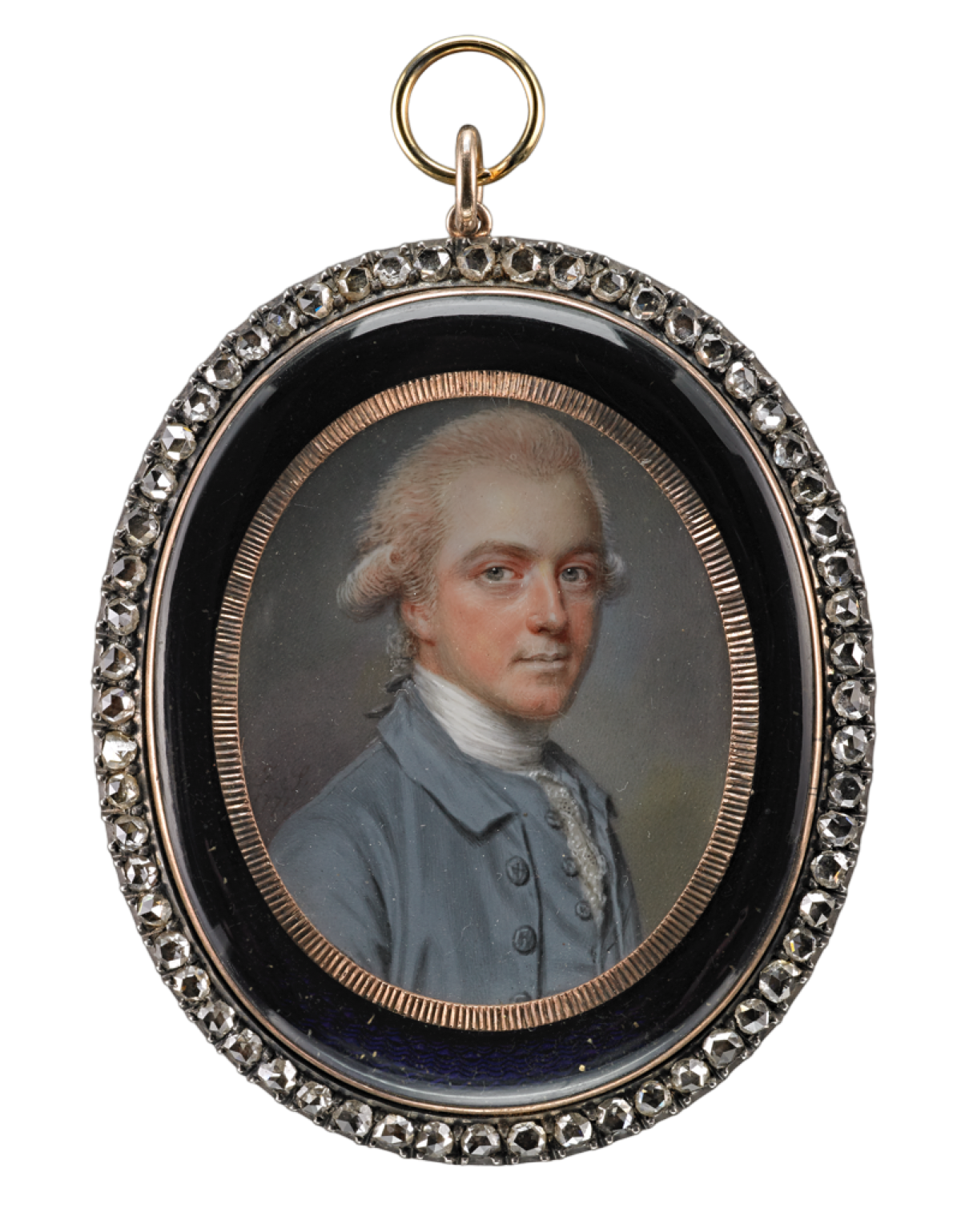 Dieses kleine Porträt eines jungen Mannes in blauer Jacke und weißem Hemd wurde ehemals als Armband-schließe benutzt. Es ist ein „schmuckloser“ Smart, die Kleidung ist relativ einfach. Meist wurden die Herren in eleganten Jacken oder Uniformen und gepuderten Haaren dargestellt. Das Bild ist signiert und 1776 datiert.