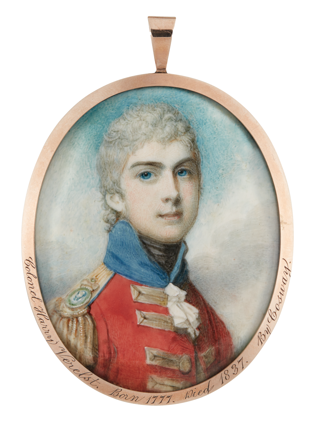 Das Porträt von ca. 1800 zeigt Colonel Harry Verelst in roter Uniformjacke mit Epauletten, Krawatte, blauem Kragen und gepuderten Haaren.