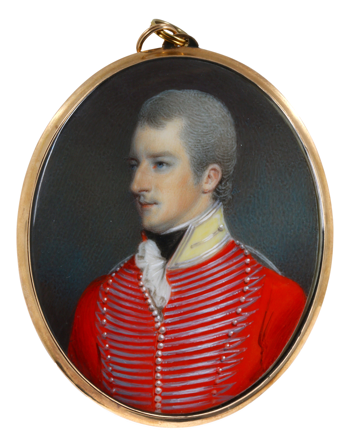 Das Porträt des Offiziers in roter Jacke mit blauem Kragen und Epauletten zeigt ein charakteristisches Merkmal in Barry‘s Werk, kräftige, scharf abgewinkelte Augenbrauen. Die Miniatur ist besonders aufwendig gerahmt und hat auf der Rückseite ein Flechtwerk aus den Haaren des Dargestellten.