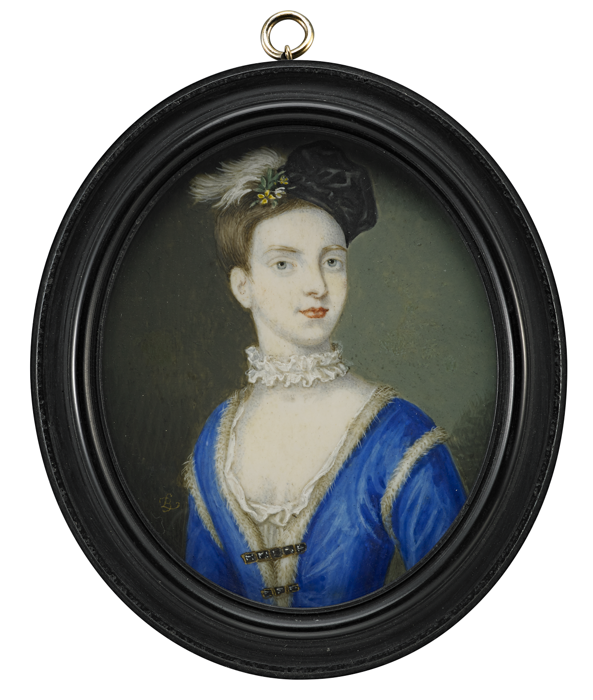 Signiert mit Initialen, datiert 1734 auf der Rückseite. Arabella Thompson wird hier in einem blauen Kleid, weißer Halskrause und einem schwarzen Barrett mit Feder gezeigt.