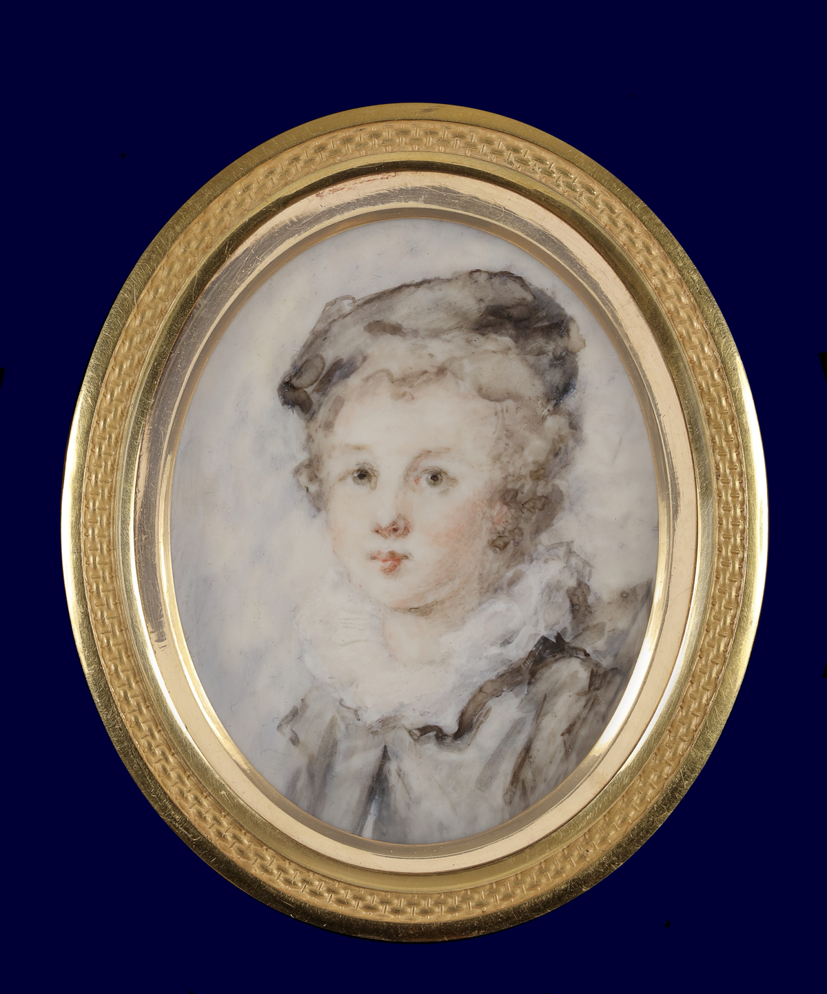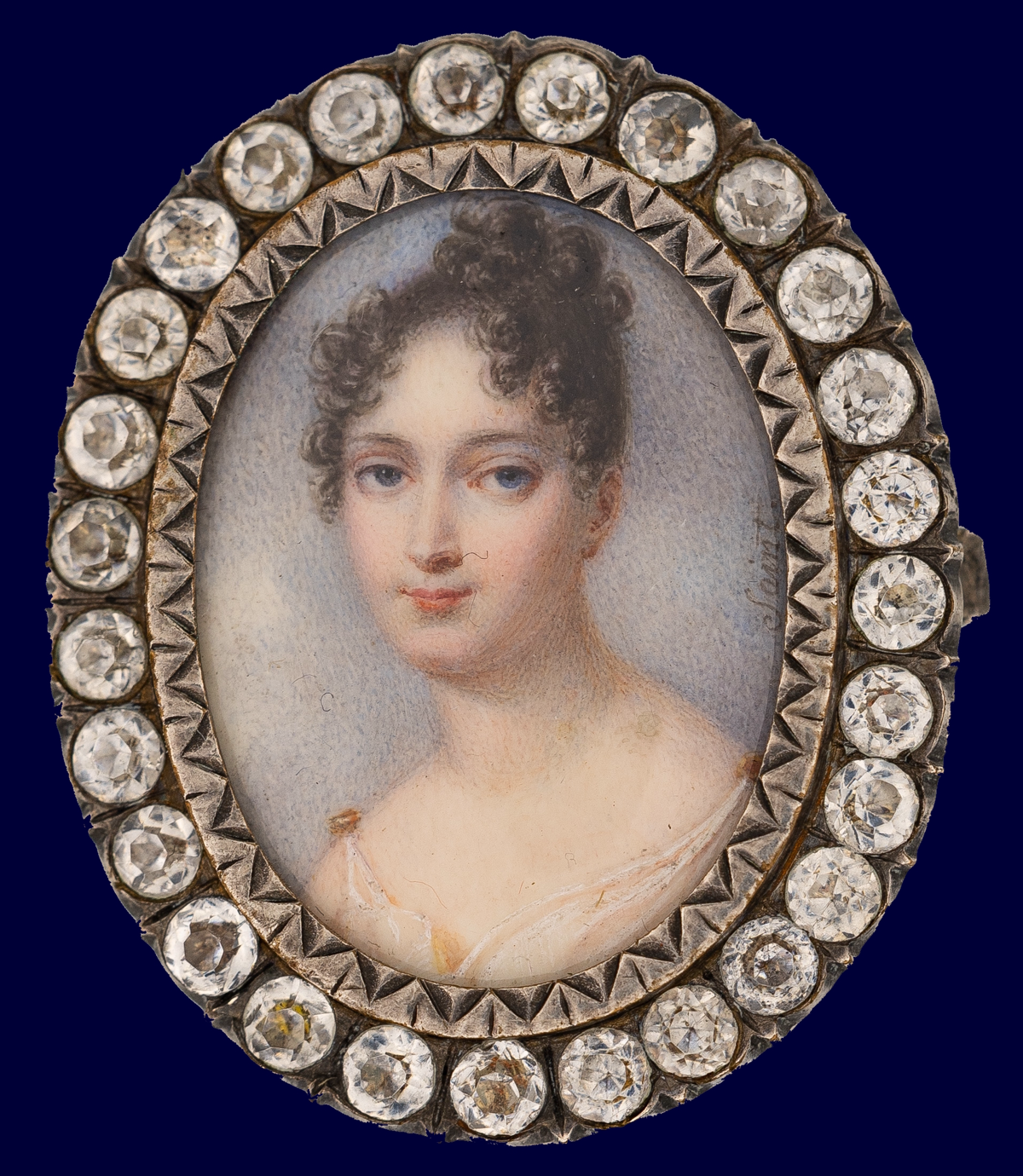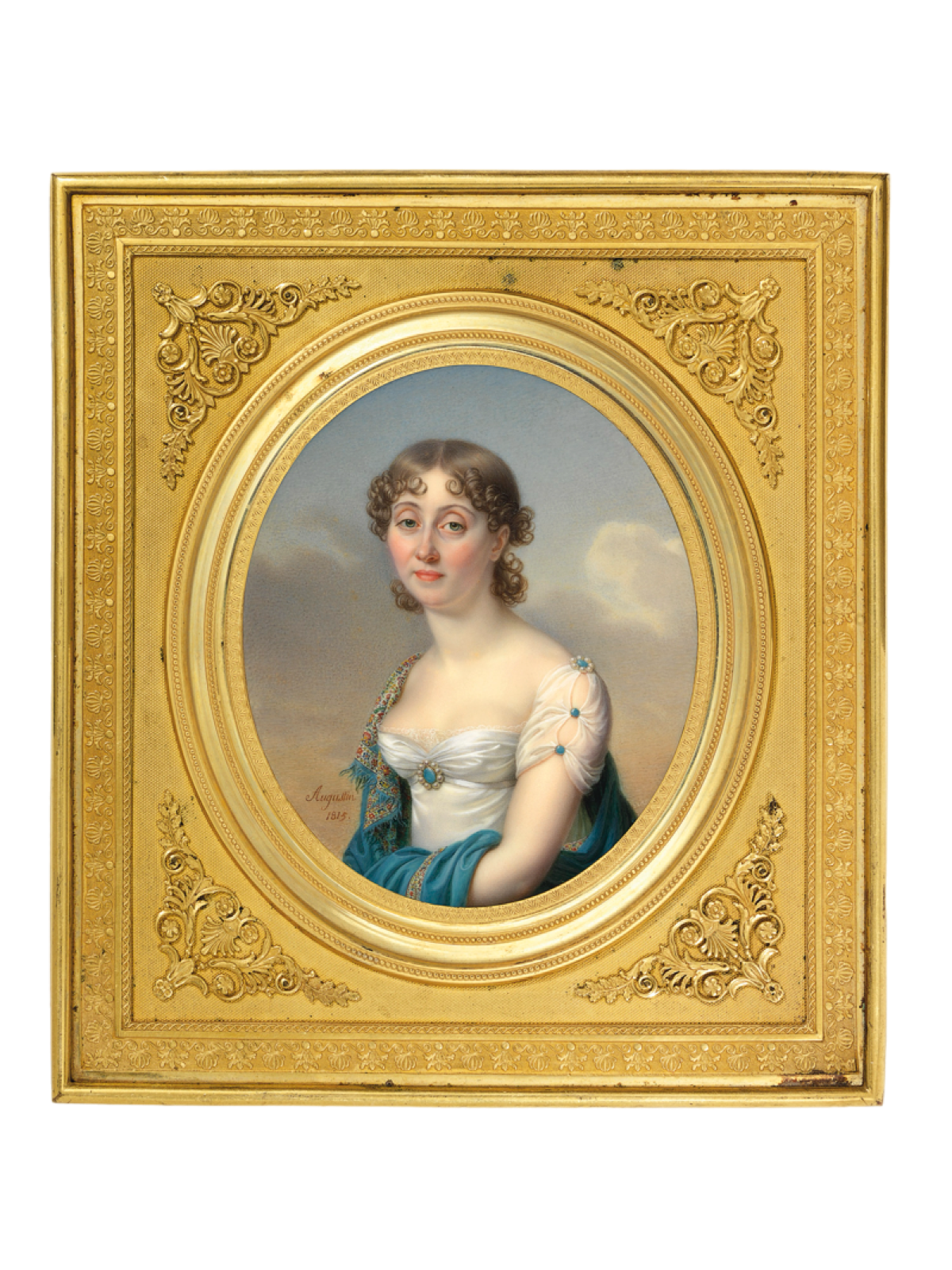 Jean-Baptiste Augustin, der größte französische Miniaturist seiner Zeit, hat dieses faszinierende Bild einer jungen Dame in weißem Kleid mit blauem Kaschmirschal gemalt. Der Künstler verstand es, das Modell zwar sanft und anmutig wiederzugeben, vertuschte dessen prägnante Gesichtszüge keineswegs. Er zählte in punkto Feinheit zu den größten Virtuosen. Einem Kunstkritiker aus dem frühen 19. Jahrhundert verschlug es beim Betrachten von Augustins Werken die Sprache. Sie brächten einen regelreicht zur Verzweiflung, weil man sich nicht erklären könne, wie es möglich sie, so etwas zu malen.