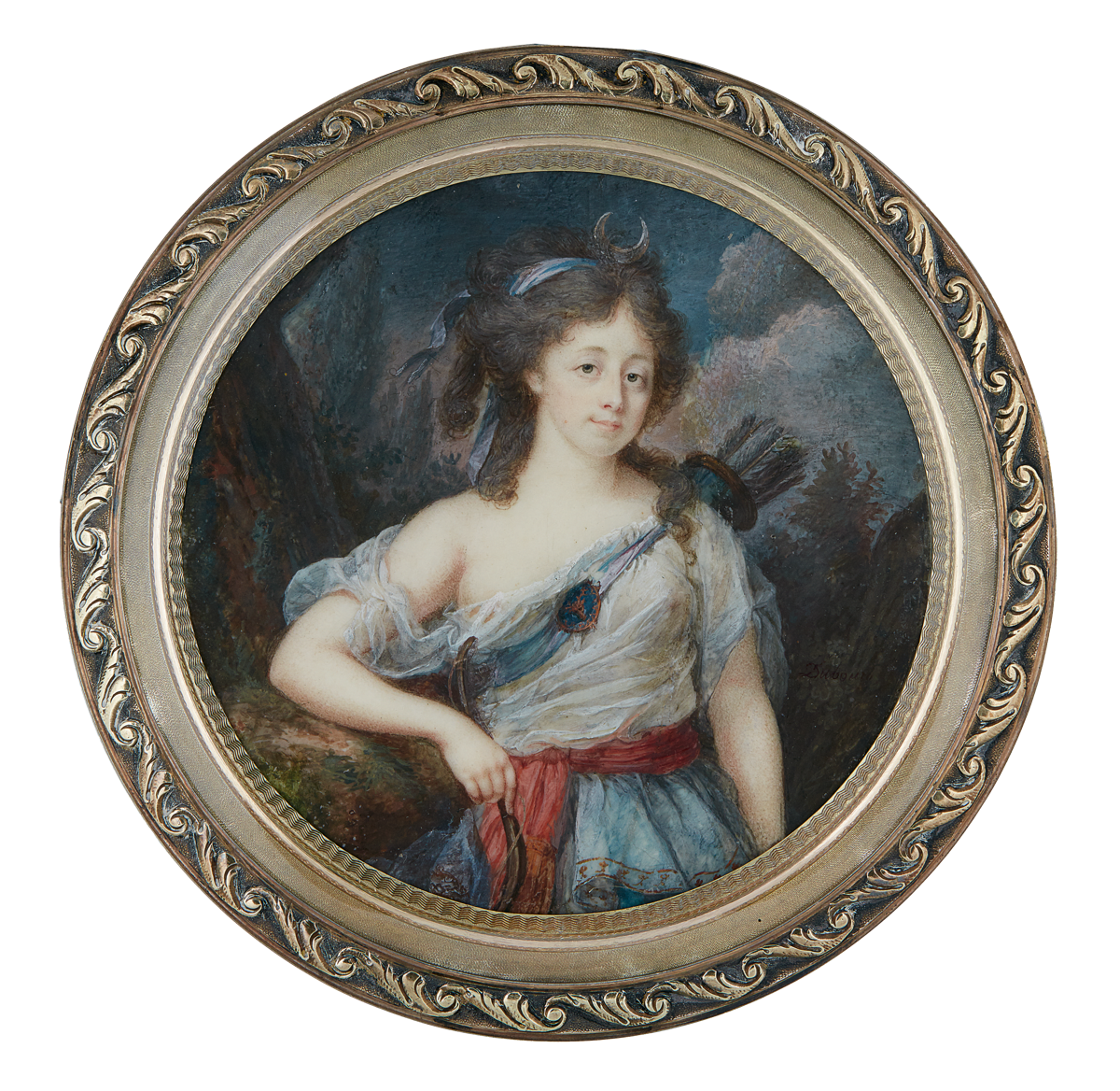 In Damenporträts war die Verkleidung als antike Jagdgöttin Diana beliebt. Diese galt als besonders keusch und sittsam. Mit solchen Tugenden wurde aber bloß kokettiert, wie dieses Werk Dubourgs von 1790 zeigt . Die dargestellte Dame trägt ein durchscheinendes, tief über die Schulter gerutschtes Kleid. Sie deutet mit dem Zeigefinder auf den Bogen, um damit ihre Liebe zum Adressaten des Bildnisses auszudrücken.