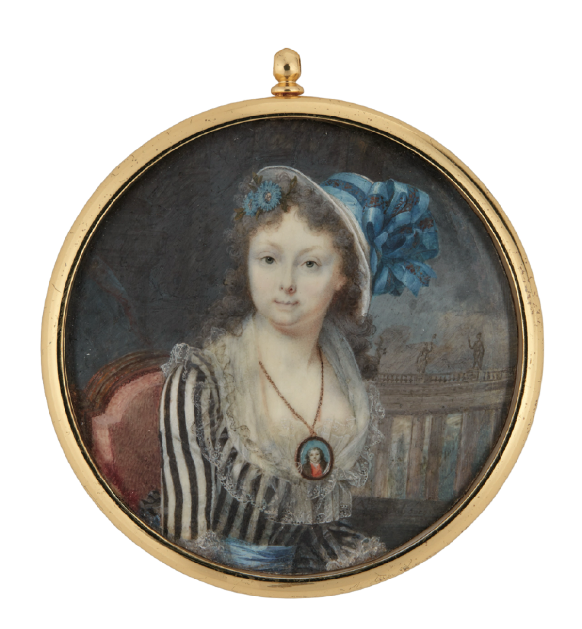 Dubourg, Augustin (1750 - 1800), Wie in diesem Bild von ca. 1795 zu sehen, wurden Miniaturen gerne als Medaillon an einer Halskette getragen. Diese junge Dame in gestreiftem Kleid mit Spitzenbesatz schmückt sich mit dem Porträt ihrem Liebsten.