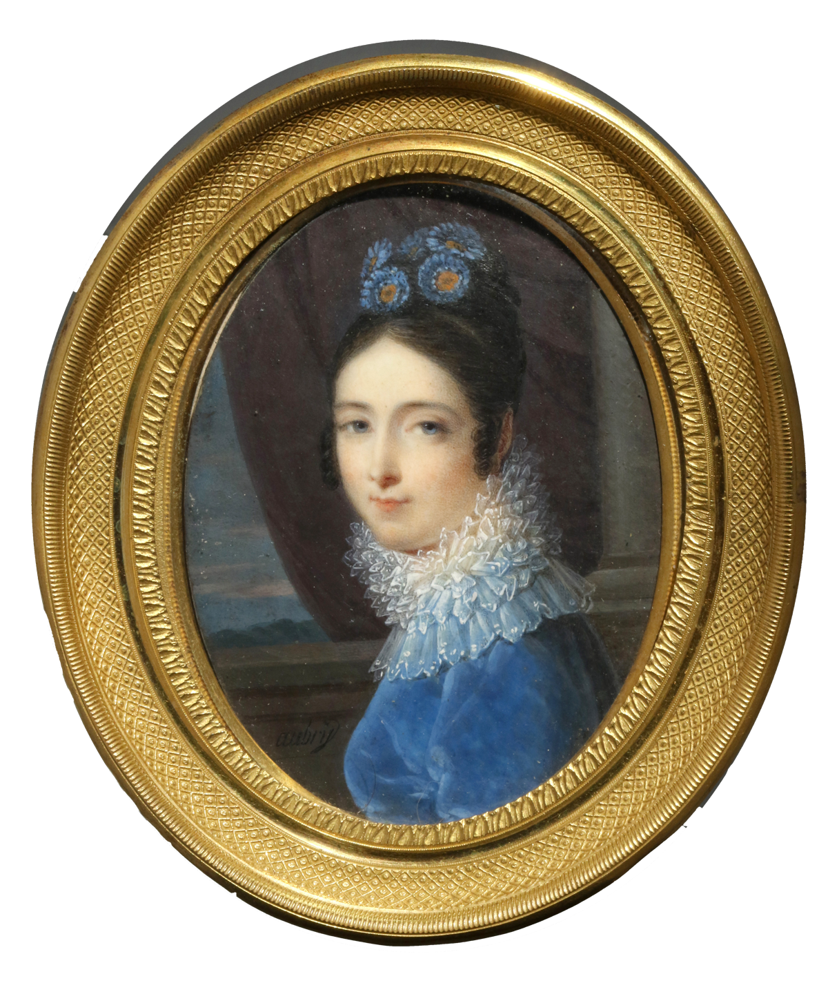 Eines von Aubrys lieblichen Damenporträts zeigt eine Dame in blauem Samtkleid mit Spitzenkragen. Sie ist im Profil, aber mit dem Betrachter zugewandten Kopf dargestellt.