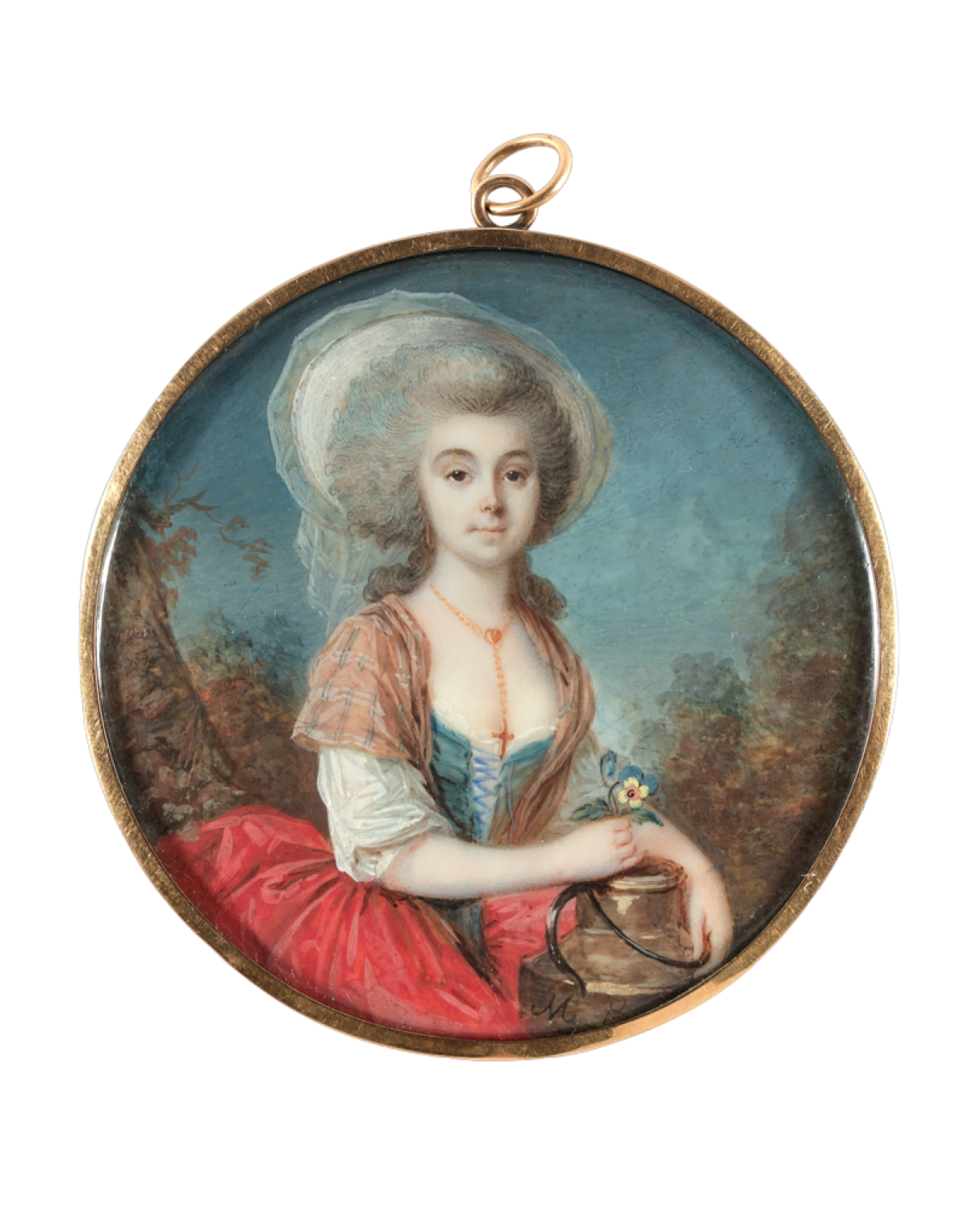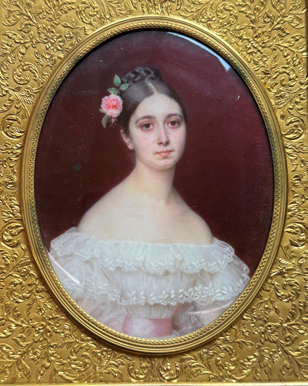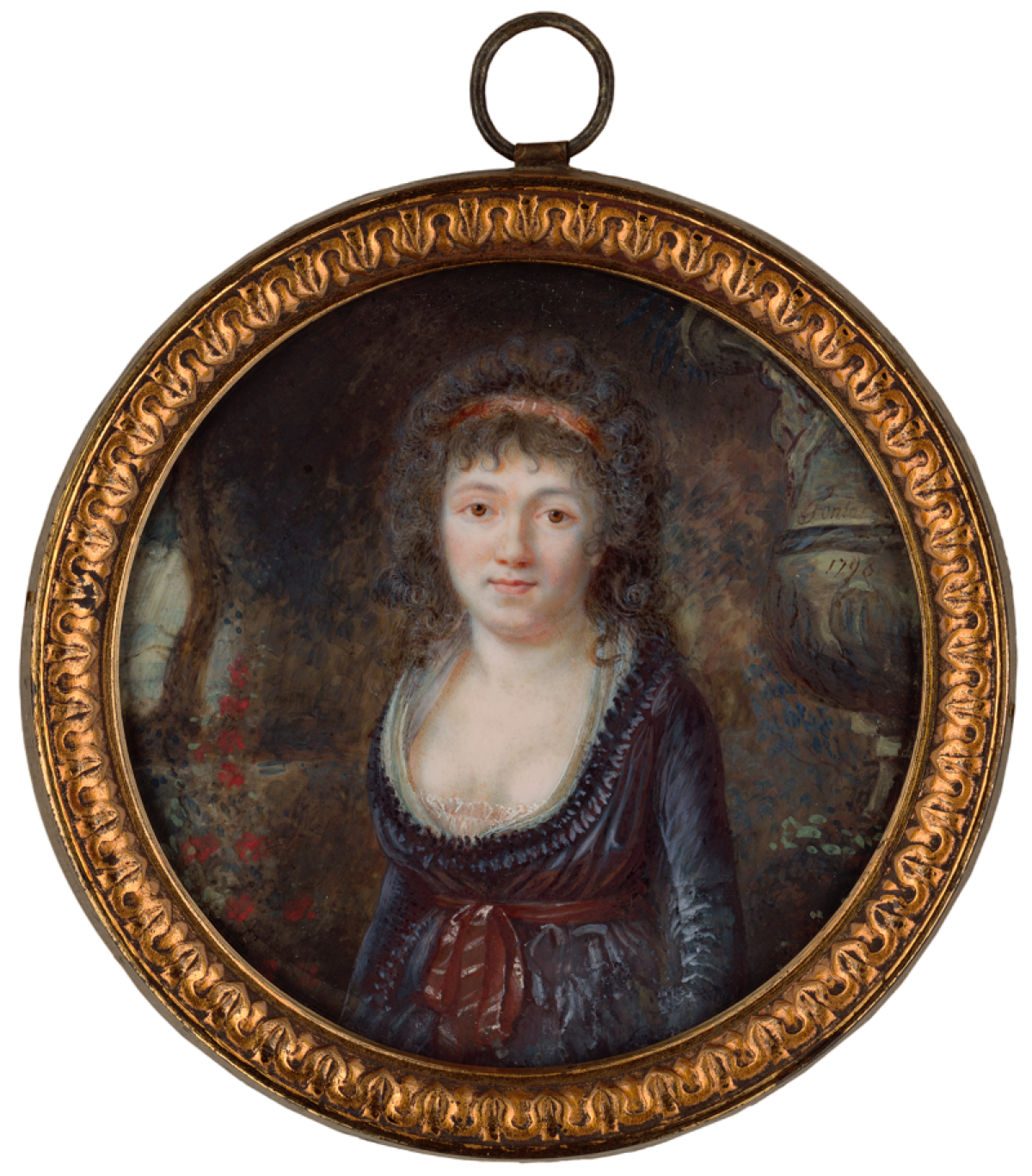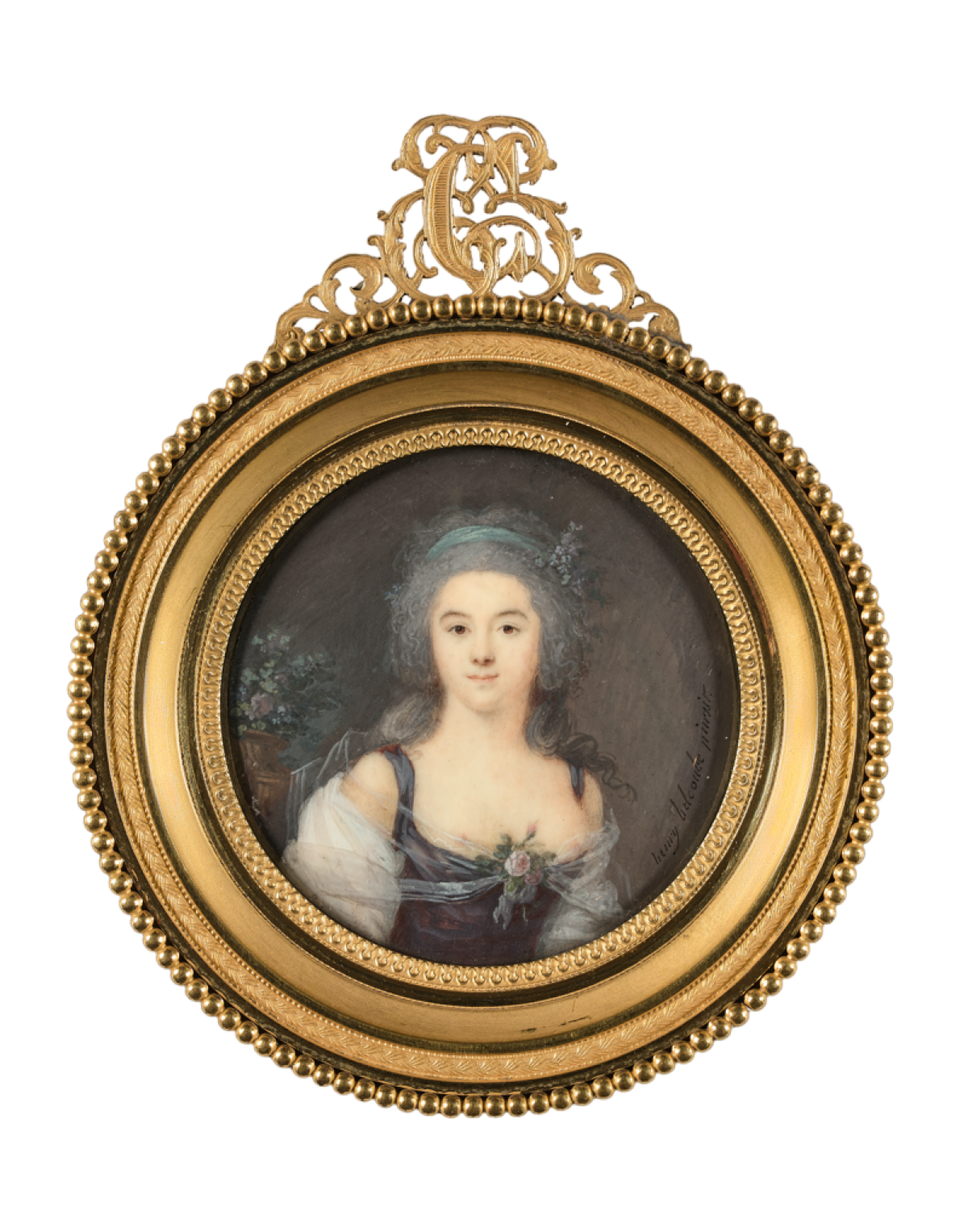 Diese typisch französische Miniatur wurde zwischen 1785 und 1790 gemalt. Der Maler ist weitgehend unbekannt. Die junge Frau mit einer Rose an der Corsage ist nahezu frontal dargestellt und schaut den Betrachter an.