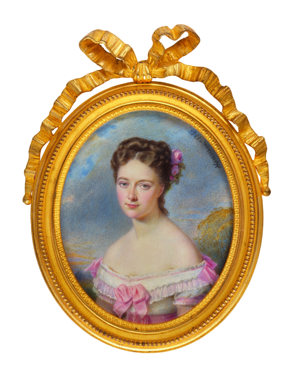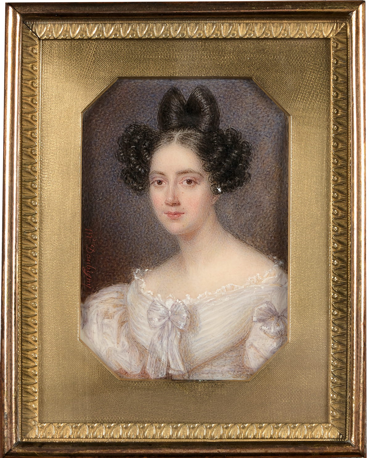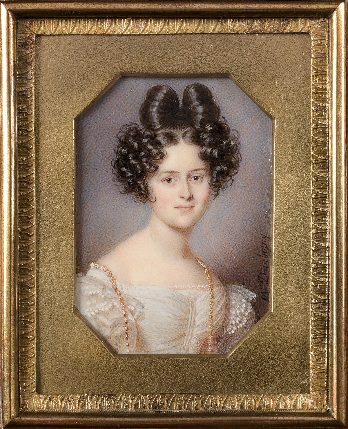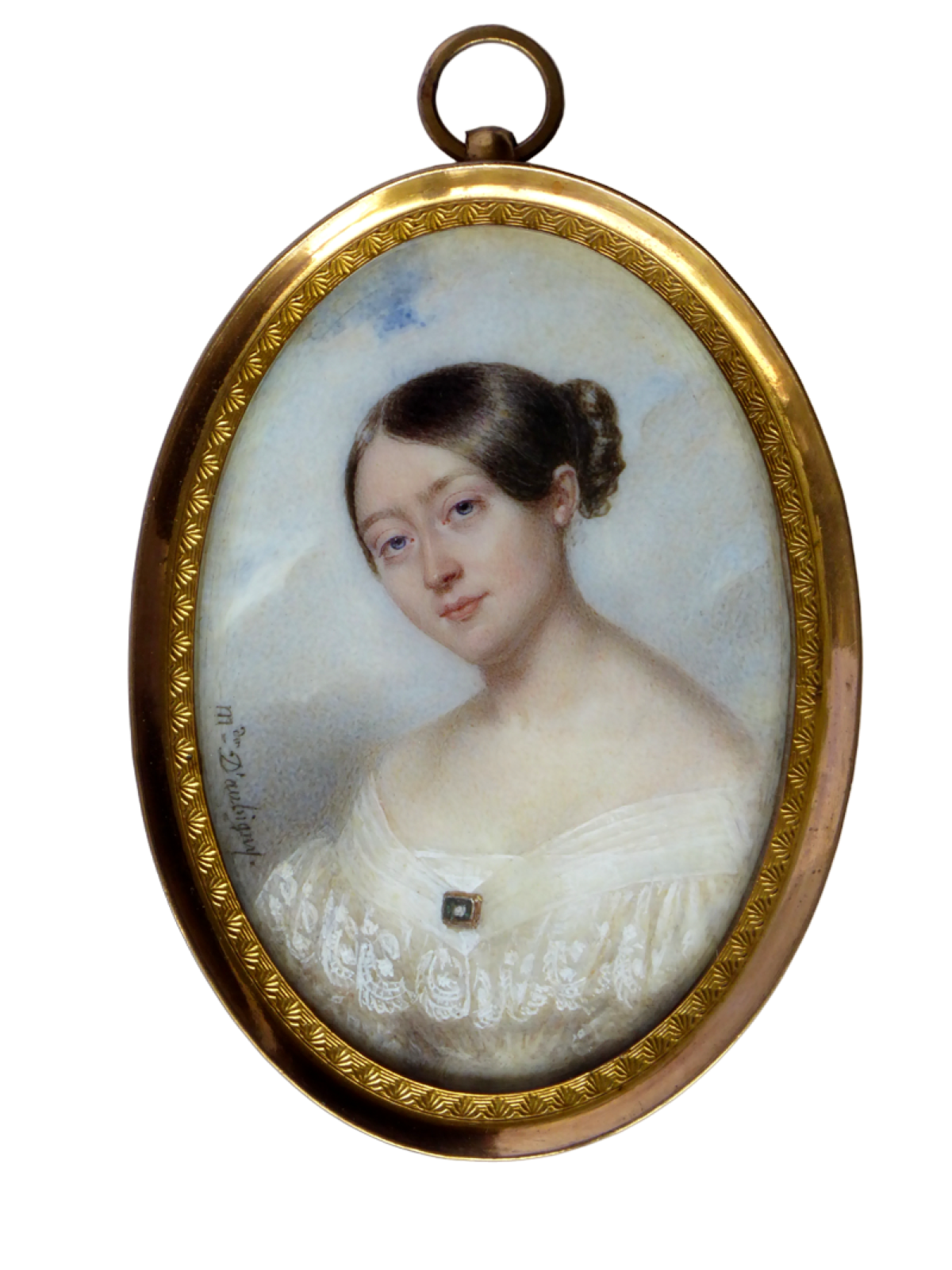 Diese junge Frau in schulterfreiem weißen Kleid, Spitzenbesatz und Brosche vor wolkigem Hintergrund scheint durch ein ovales Fenster mit dem Bildbetrachter Kontakt aufnehmen zu wollen. Gemalt wurde sie um 1830.