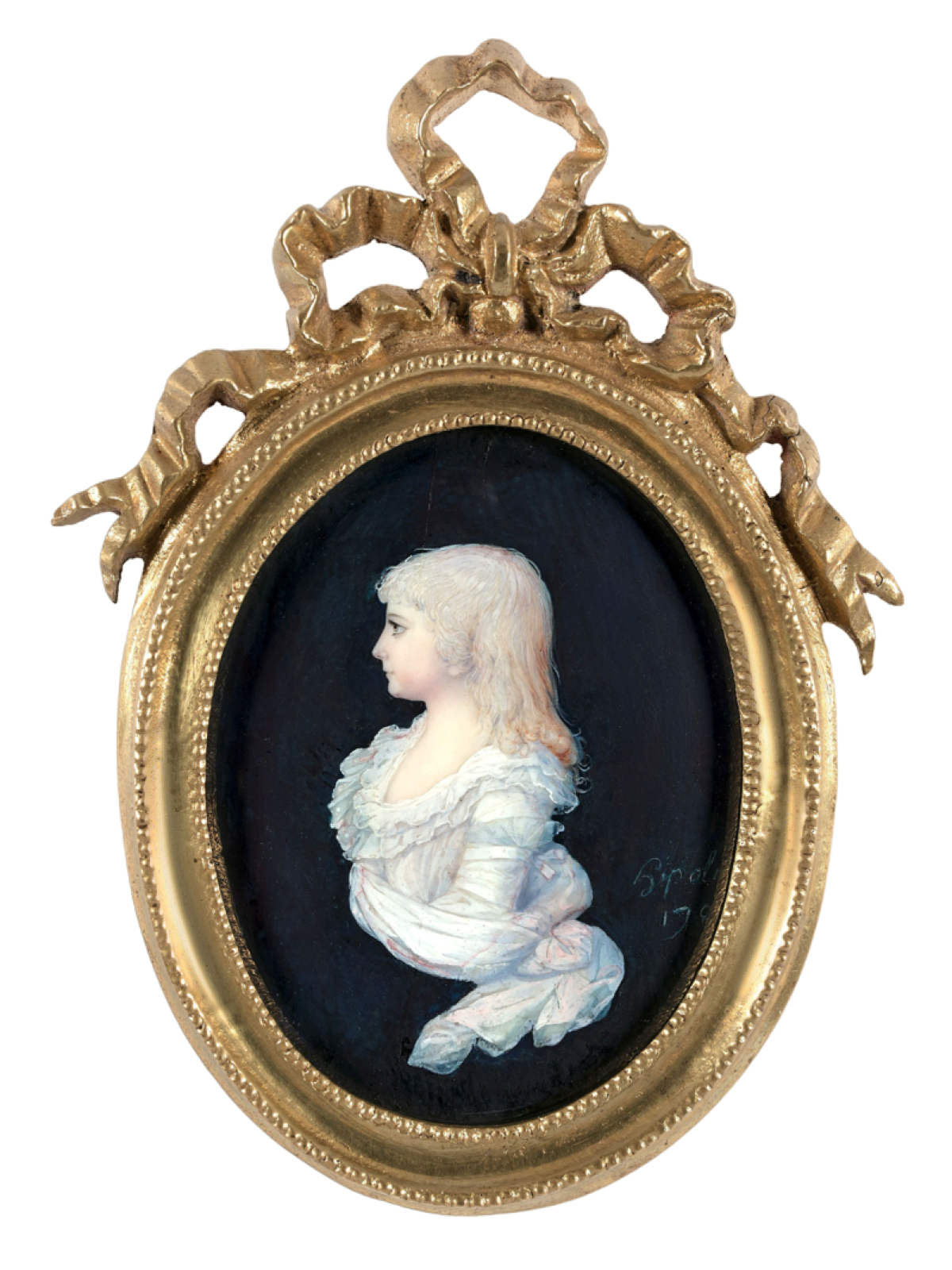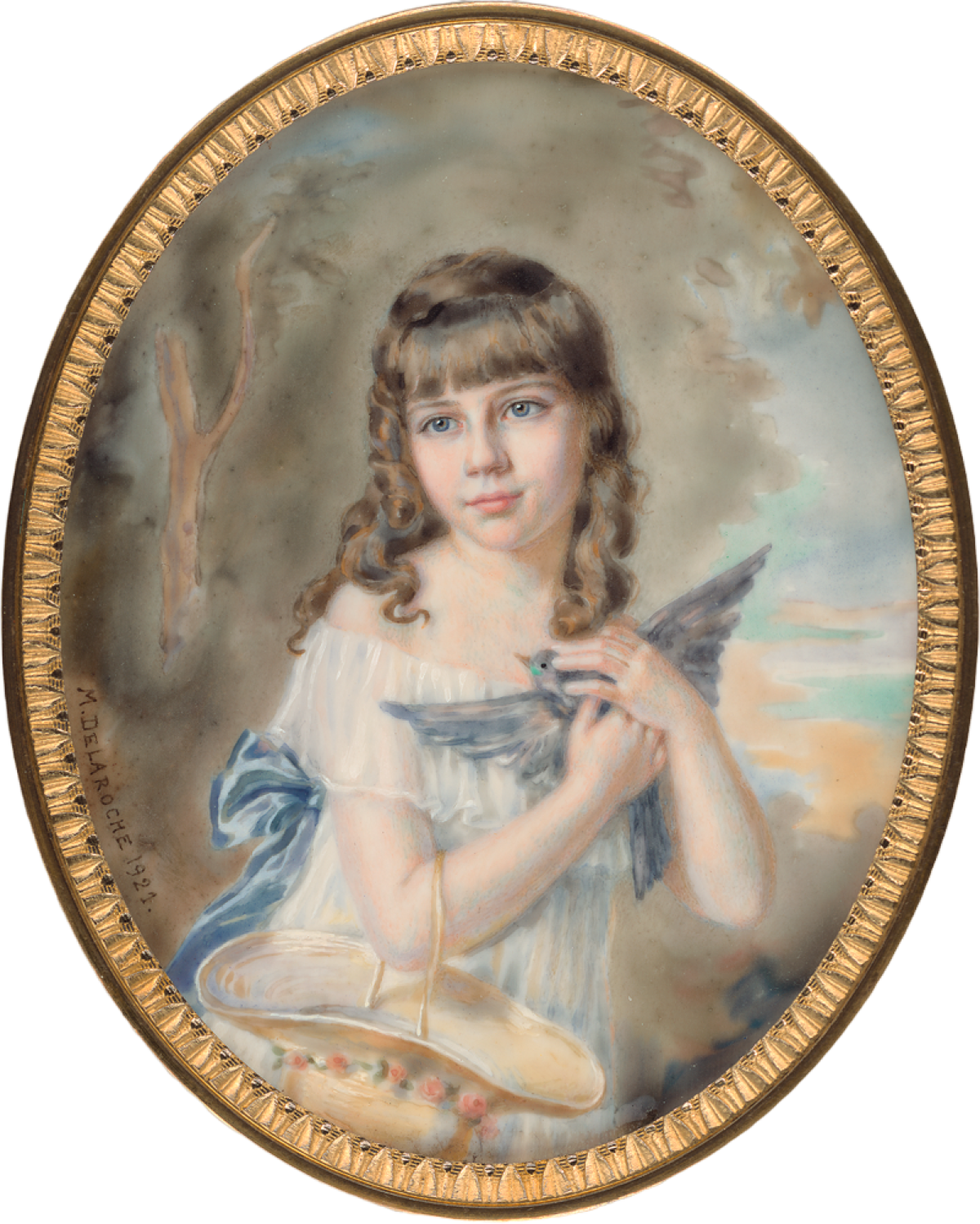 Auch im 20. Jahrhundert gab es noch hervorragende Miniaturisten. 1921 malte Marguerite Delaroche die neunjährige Louise de Benoist de Gentissart (1912 – 1995) in weißem Kleid mit blauer Schleife. Sie drückt eine Taube an die Brust, ihr Strohhut hängt am Arm.