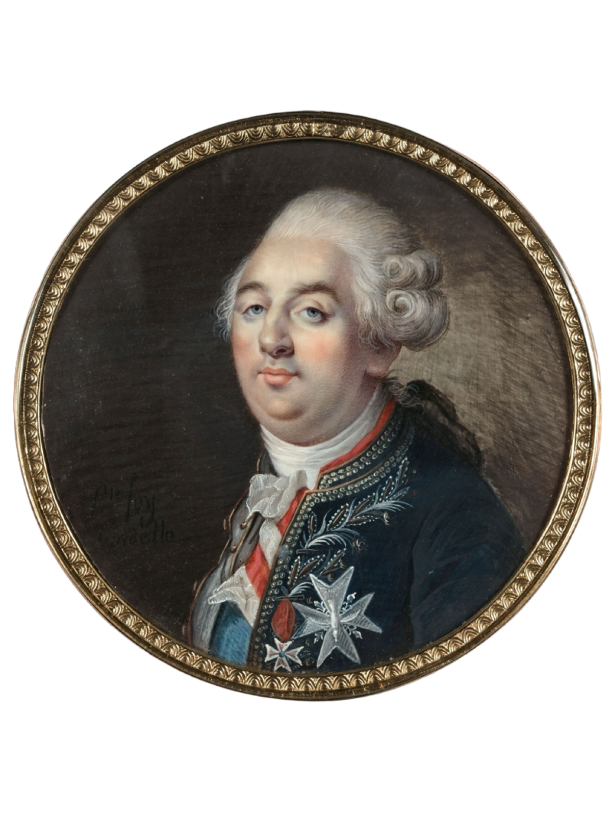 Madame Cordelle malte Ludwig XVI vermutlich 1792 kurz vor seiner Absetzung als König von Frankreich in blauer Uniformjacke mit Stickerei und Orden.