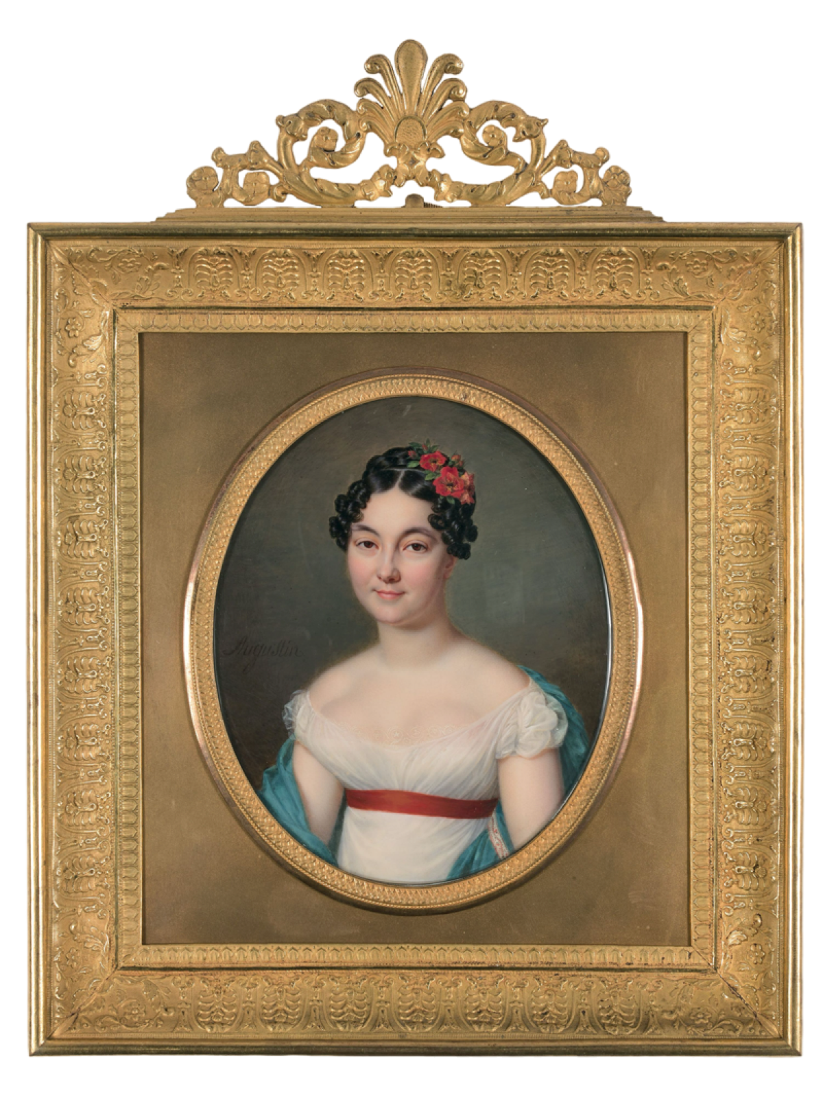 Ein weiteres Beispiel für die hohe Kunst Augustins ist dieses Bildnis einer jungen Dame in weißer Robe mit rotem Gürtel und blauem Schal. Rote Blumen schmücken ihre dunklen Locken.