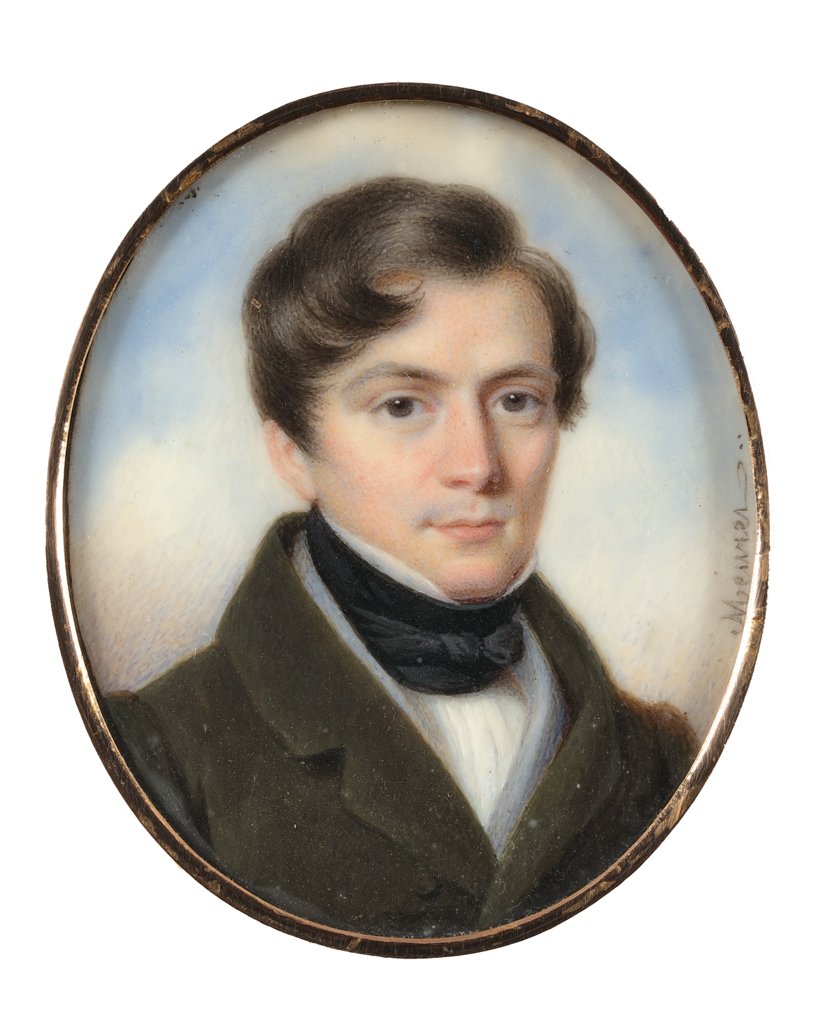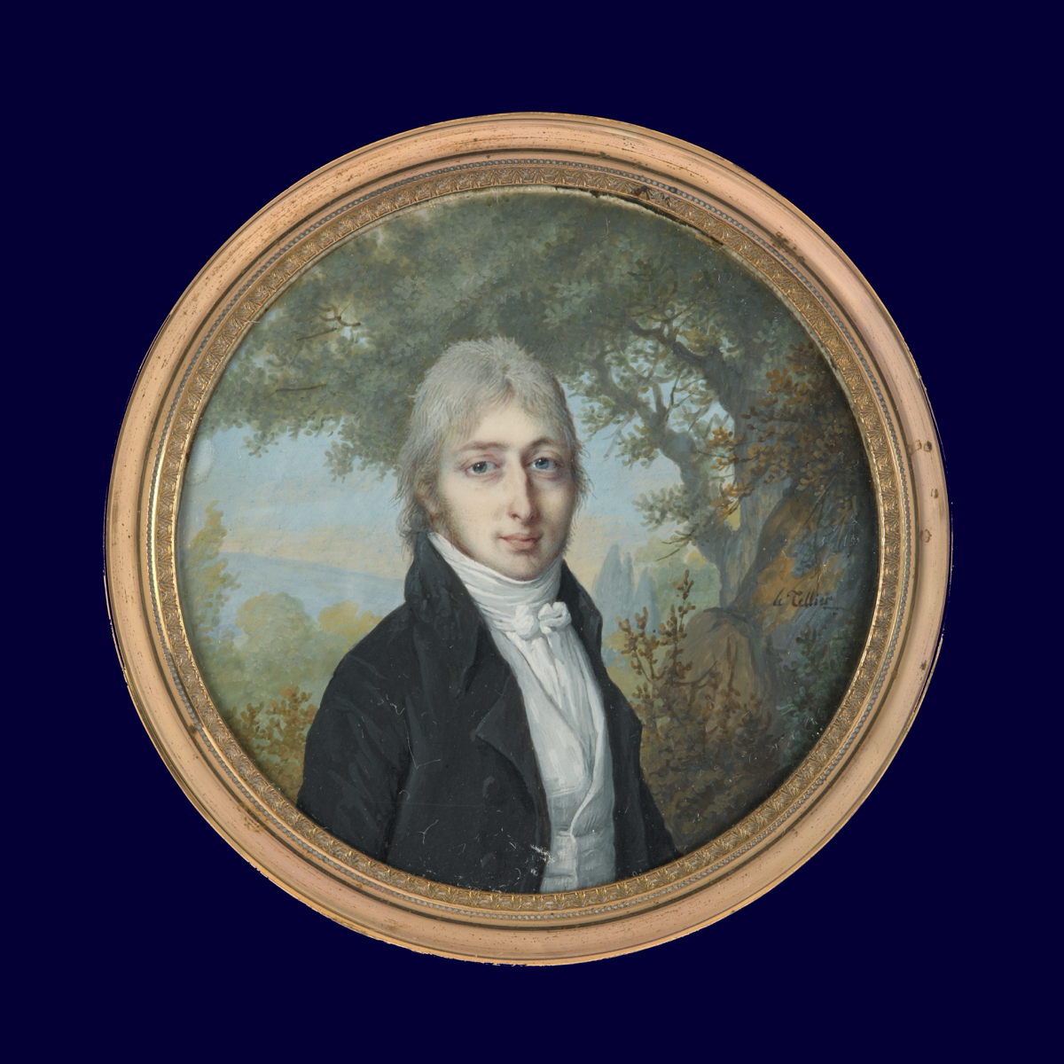 Diese sehr detailliert gemalte Miniatur zeigt einen jungen Mann in weißem Hemd mit Schleife, darüber eine dunkle Jacke. Im Hintergrund eine Landschaft. Die Signatur befindet sich rechts auf einem Felsen.