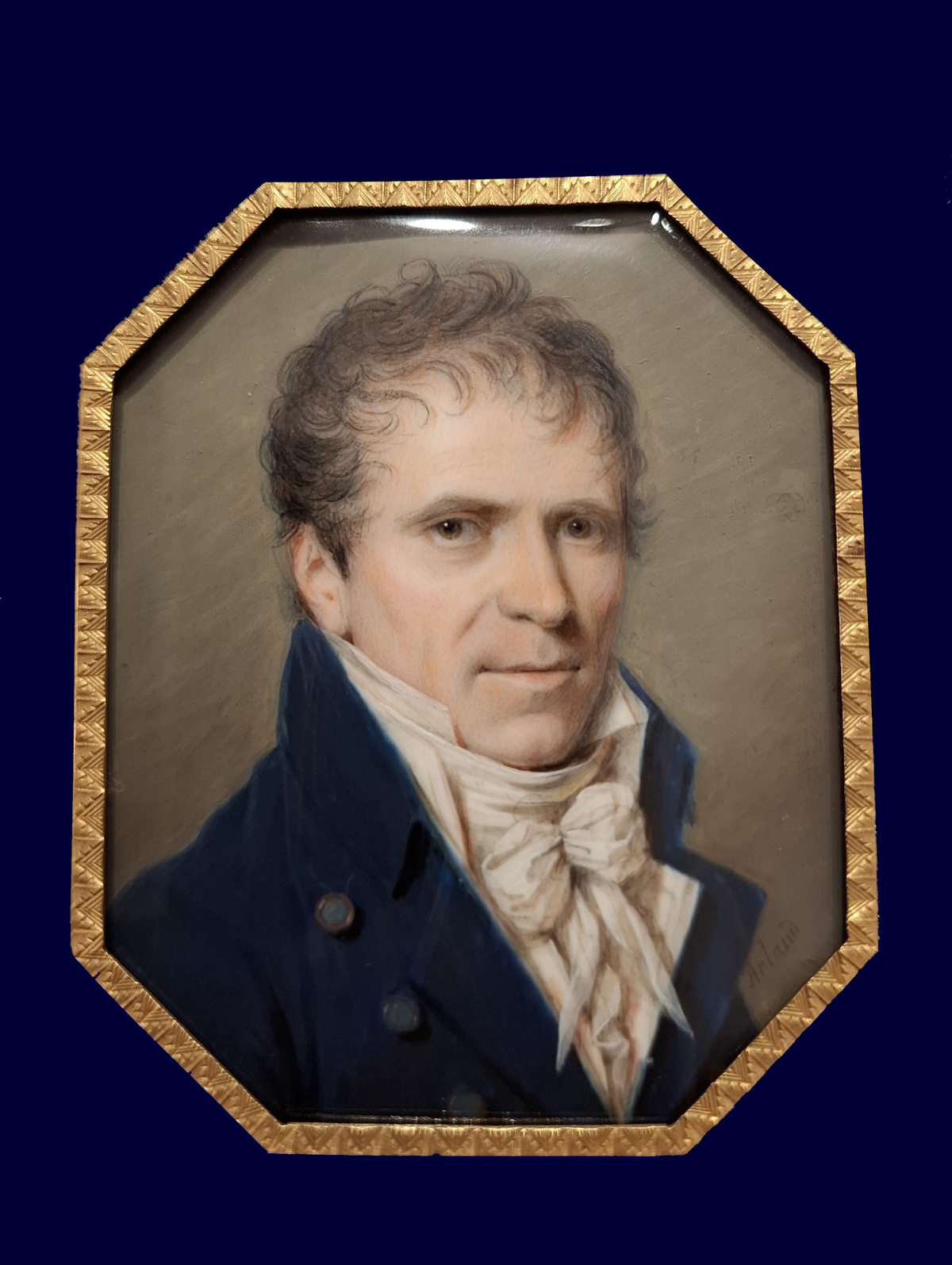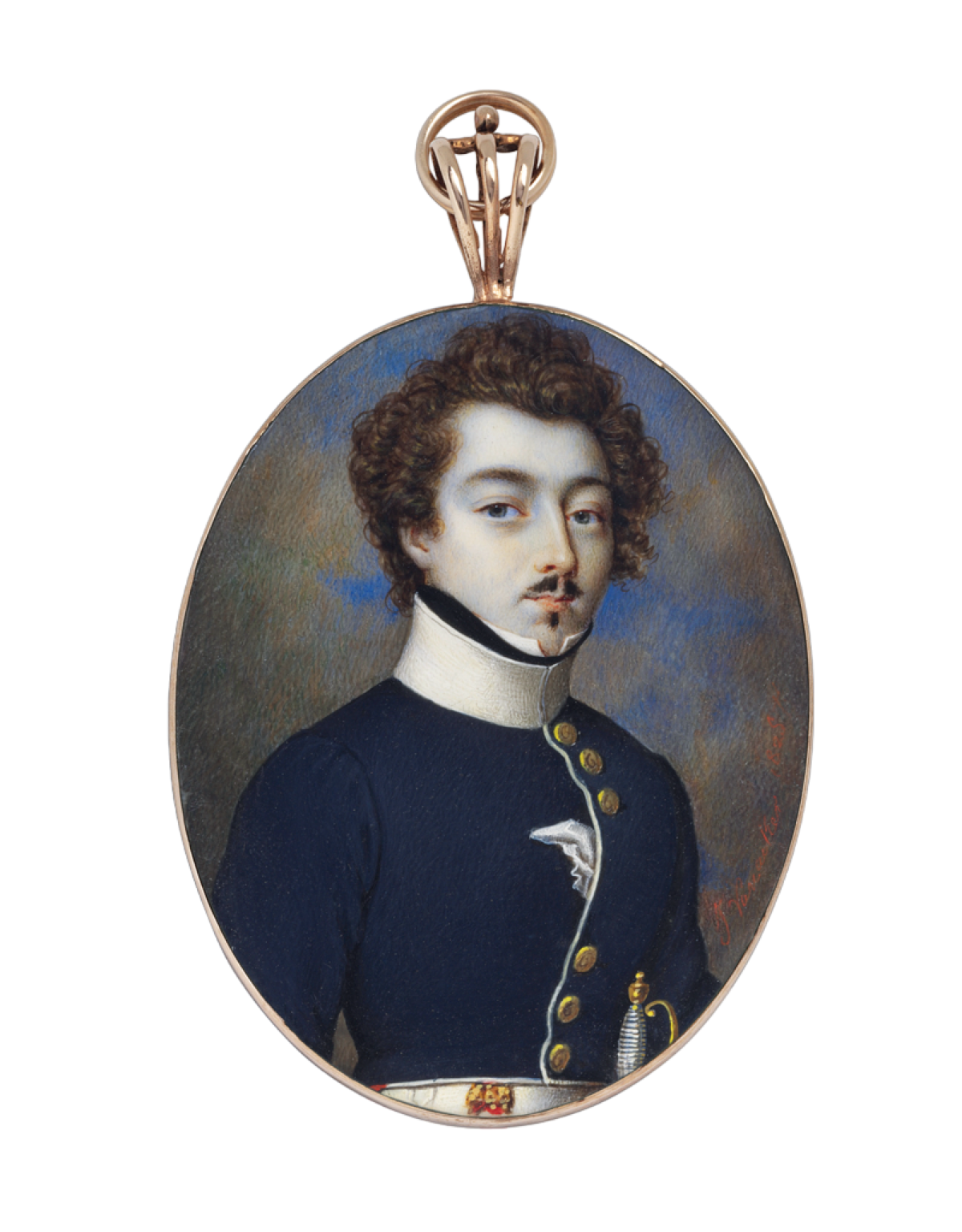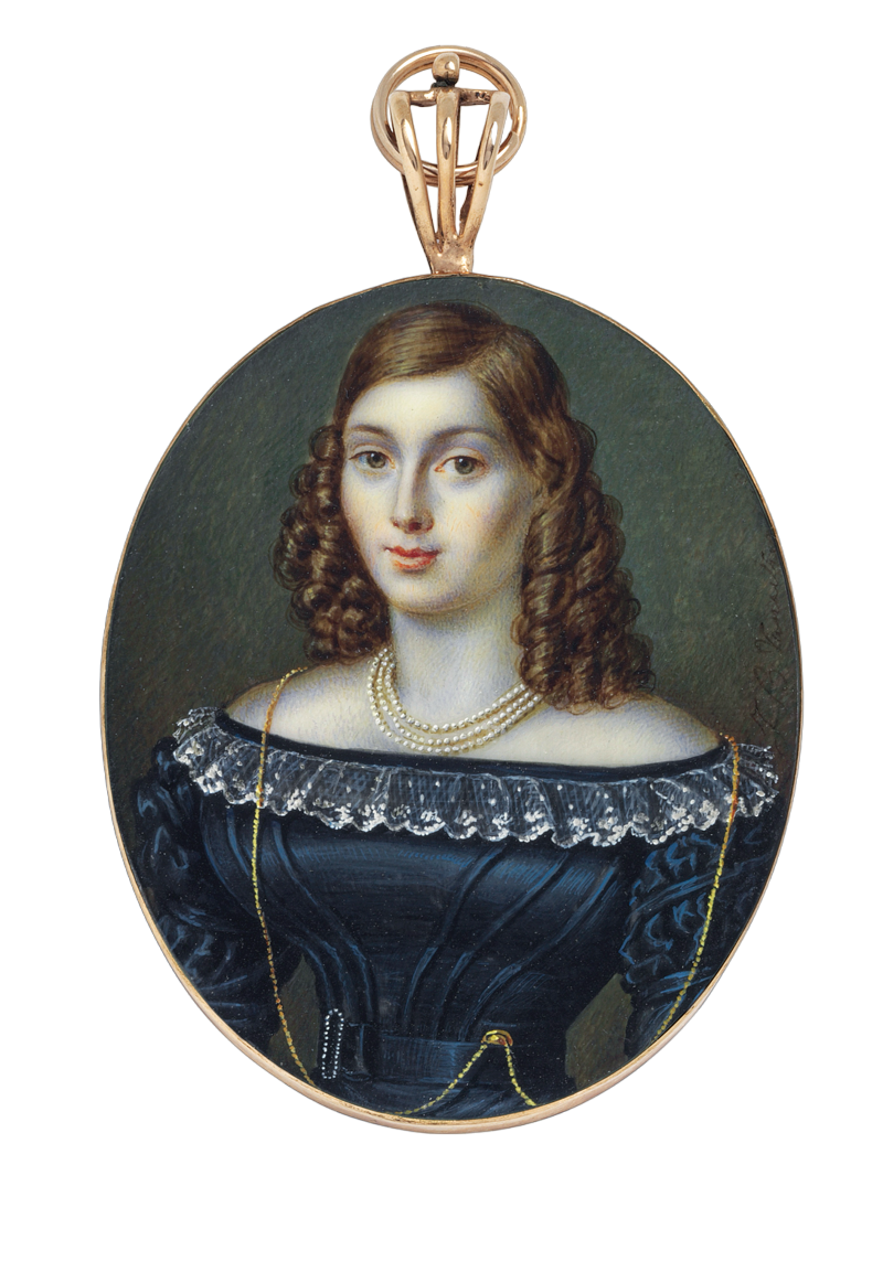 Dieses attraktive junge Paar malte Vanacker 1825. Er ist blauer Uniform mit Goldknöpfen und weißem Kragen dargestellt. Sie, vermutlich seine Frau, trägt ein dunkelblaues Seidenkleid mit Spitzenkragen, dazu eine dreireihige Perlenkette und eine lange Goldkette.
