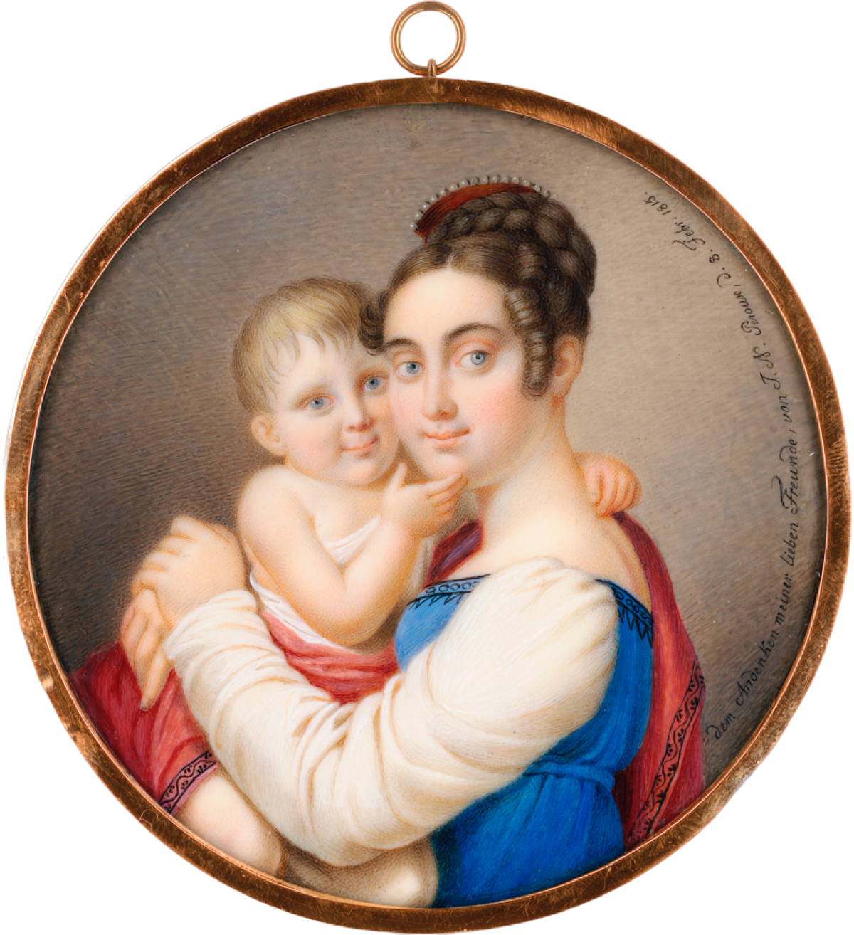 Selten wurde ein Bildnis auf der Vorderseite auch explizit mit einer Widmung versehen. Das Doppelporträt einer Mutter mit ihrem Kind, das Joseph-Nicolaus Peroux 1815 schuf, trägt am Bildrand die Inschrift „dem Andenken meiner lieben Freunde, von J.N. Peroux, d. 8. Febr. 1815“