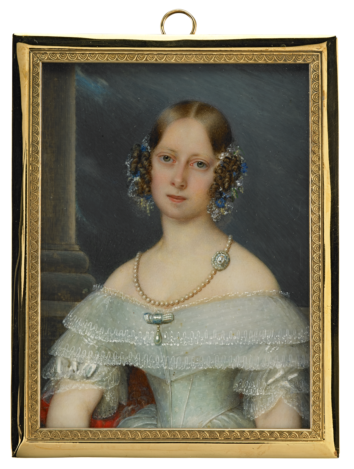 Ihr hellbraunes Haar ist kunstvoll in Seitenlocken und einem Zopfdutt mit Schildpattkamm frisiert. Sie trägt ein schulterfreies Kleid und goldene Ohrringe.