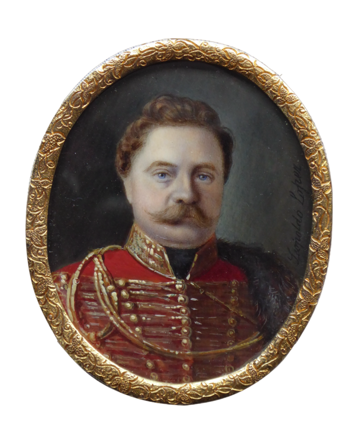 Über diesen Maler ist wenig bekannt. Gemalt hat er hier einen Offizier der spanischen Husaren „Husares de Pavia“ in roter Uniforme mit goldenen Tressen und Pelz-Dolman.