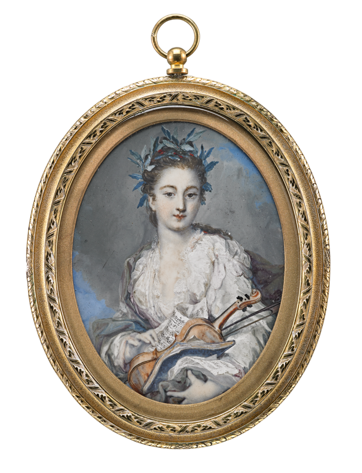 Hier ist eine junge Dame mit Violine und Notenblättern dargestellt. Sie trägt ein weißes Kleid mit grauem Schal und blaue Blütenblätter im Haar. Gemalt wurde dieses Porträt um 1710.