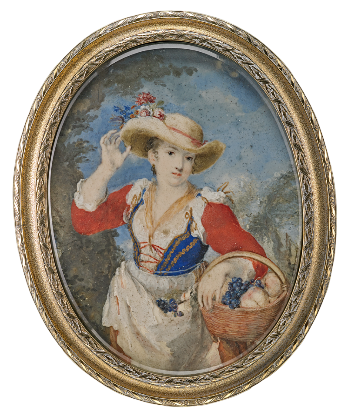 In ihrem sehr eigenen Malstil hat Rosalba Carriera hier eine junge Dame mit Strohhut und Obstkorb dargestellt.