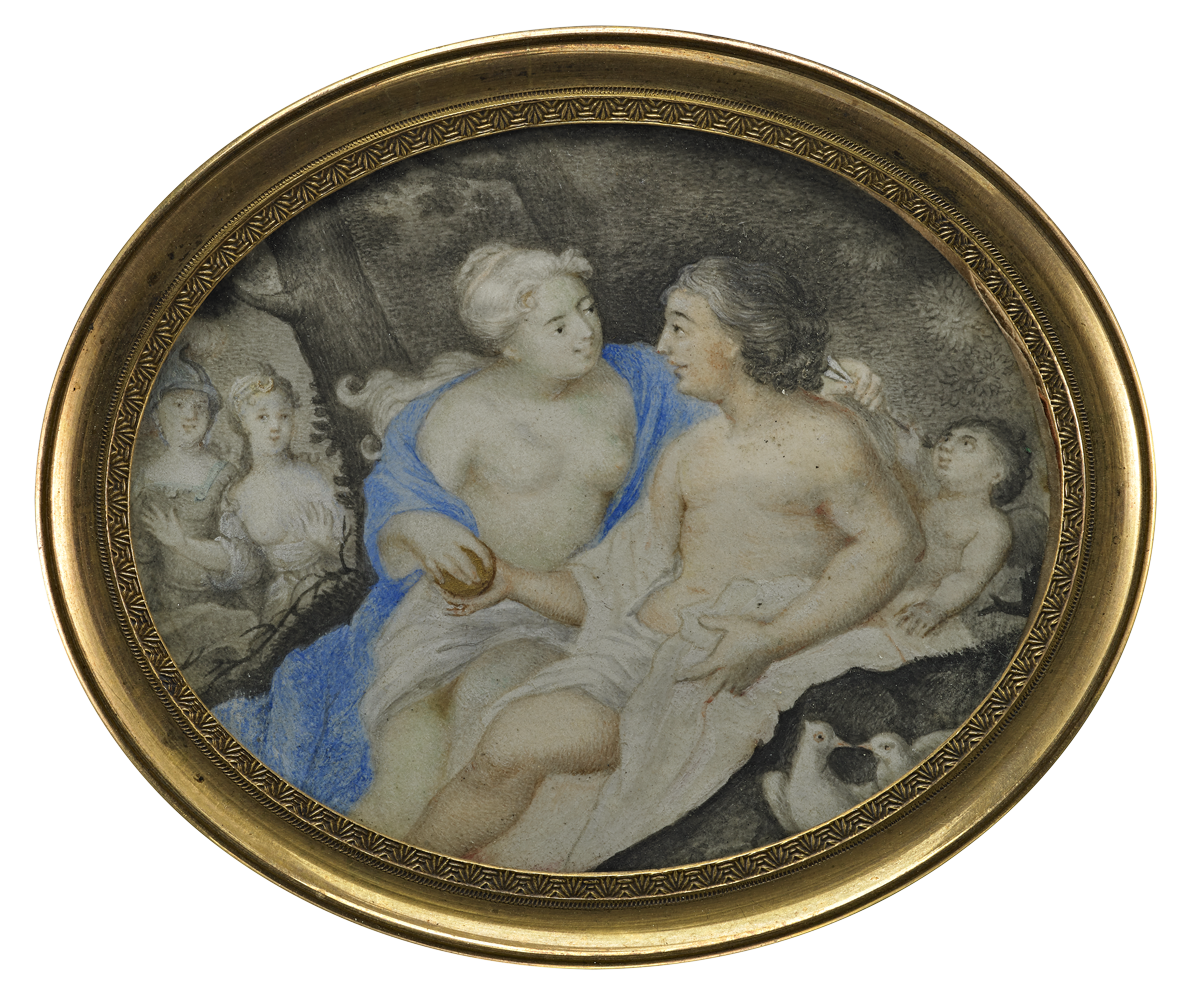 Kein Porträt sondern drei Göttinnen werden in dieser Miniatur eines unbekannten Malers gezeigt. Es ist eine Episode aus der griechischen Mythologie, bekannt als das „Urteil des Paris“. Zur Hochzeit von Peleus und Thetis waren alle Götter außer Eris, Göttin der Zwietracht, eingeladen. Beleidigt, warf sie einen goldenen Apfel mit der Aufschrift „der Schönsten“ unter die Götter. Es entbrannte ein Streit zwischen Hera, Athene und Aphrodite, wem der Apfel gebühre. Zeus legte das Urteil in die Hand eines Sterblichen, des schönen jungen Paris, Sohn des trojanischen Königs Priamos. Alle Göttinnen versuchten, den Prinzen zu bestechen: Hera versprach ihm die ganze Welt, Athene Weisheit, Aphrodite aber die Liebe der schönsten Frau der Welt – Helena – und gewann.