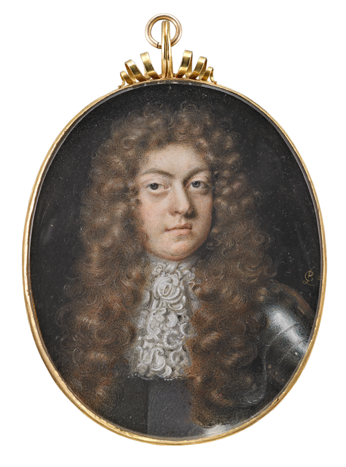 Hier sehen wir einen Herrn in Rüstung mit Spitzenjabot und einer üppigen Perücke.
