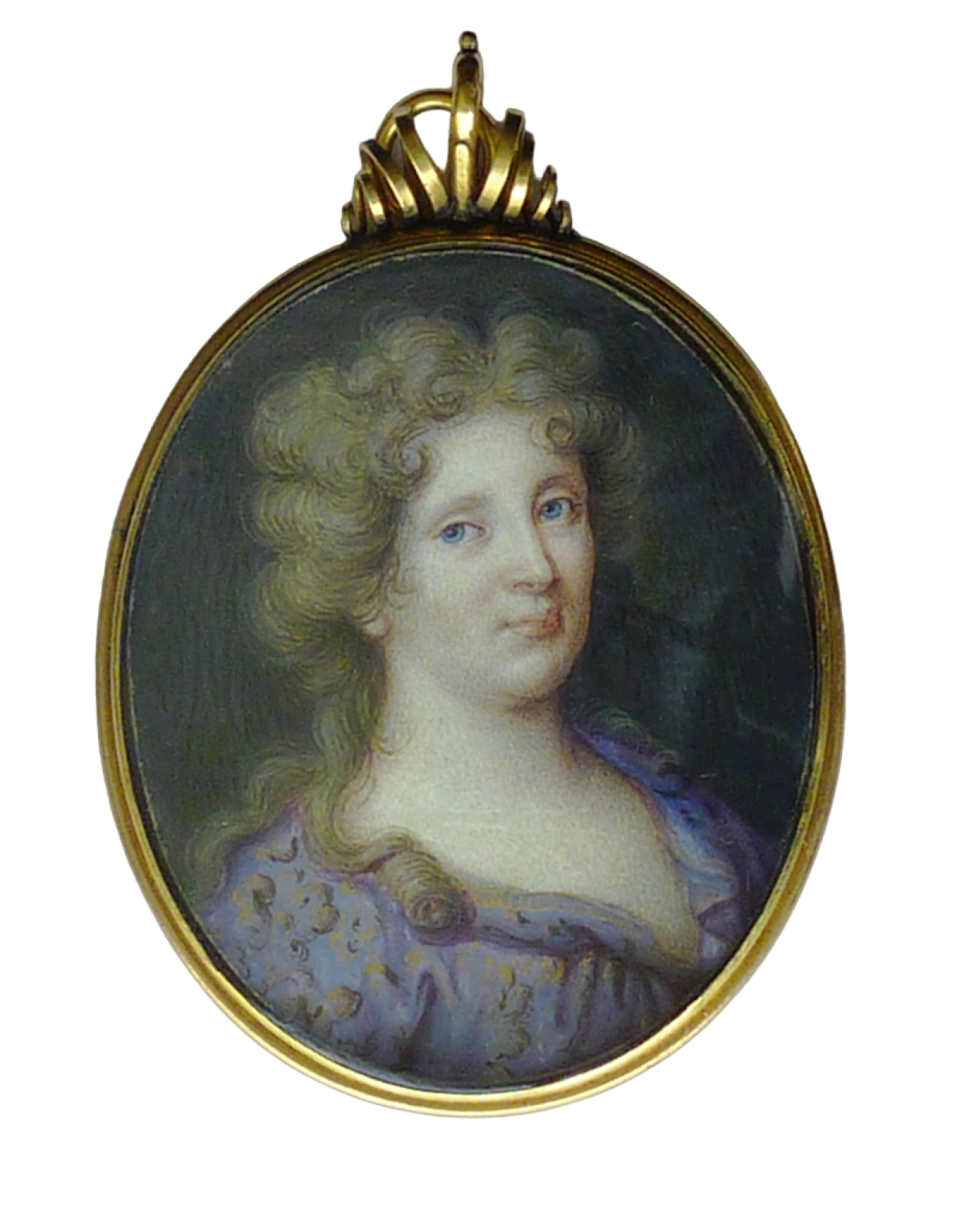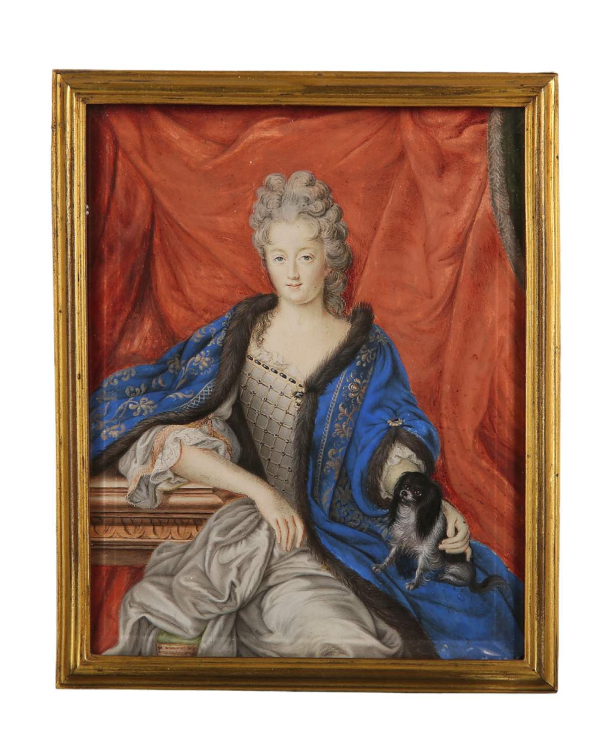 Anne Marie de Bourbon, Prinzessin de Conti (1666 – 1739) war eine legitime Tochter Ludwig XIV, seine Lieblingstochter. Die Mutter Louise de La Vallière war dessen Mätresse . Mit 13 Jahren wurde Anne Marie mit dem 18-jährigen Louis-Armand I der Bourbon, Prince de Conti verheiratet. Die Ehe war kinderlos und nicht glücklich. Nach fünf Jahren starb ihr Mann an den Pocken. Anne Marie war bekannt für Ihre Schönheit und bekam viele Heiratsanträge, u. a, vom Sultan von Marokko., hat aber nicht wieder geheiratet. Hier trägt sie ein weißes Kleid mit Edelsteinen besetztem Oberteil, darüber einen pelzbesetzten blauen Umhang. Mit der linken Hand streichelt sie ihr Schoßhündchen.