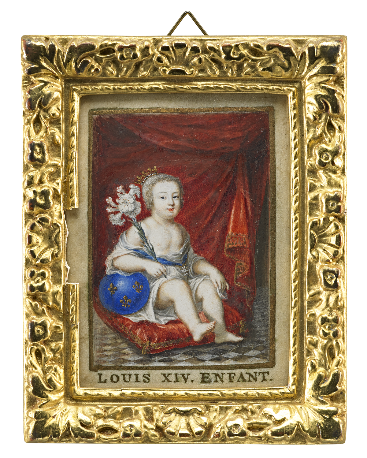Auch der Sonnenkönig Ludwig XIV war mal ein Kind. Hier thront er mit goldener Krone auf einem roten Samtkissen mit goldenen Kordeln und Quasten. Als Zepter hält er einen Lilienstrauß. Er trägt bereits den Orden Saint Esprit. Der rechte Arm ruht auf einem blauen Ball mit goldenen Lilien.