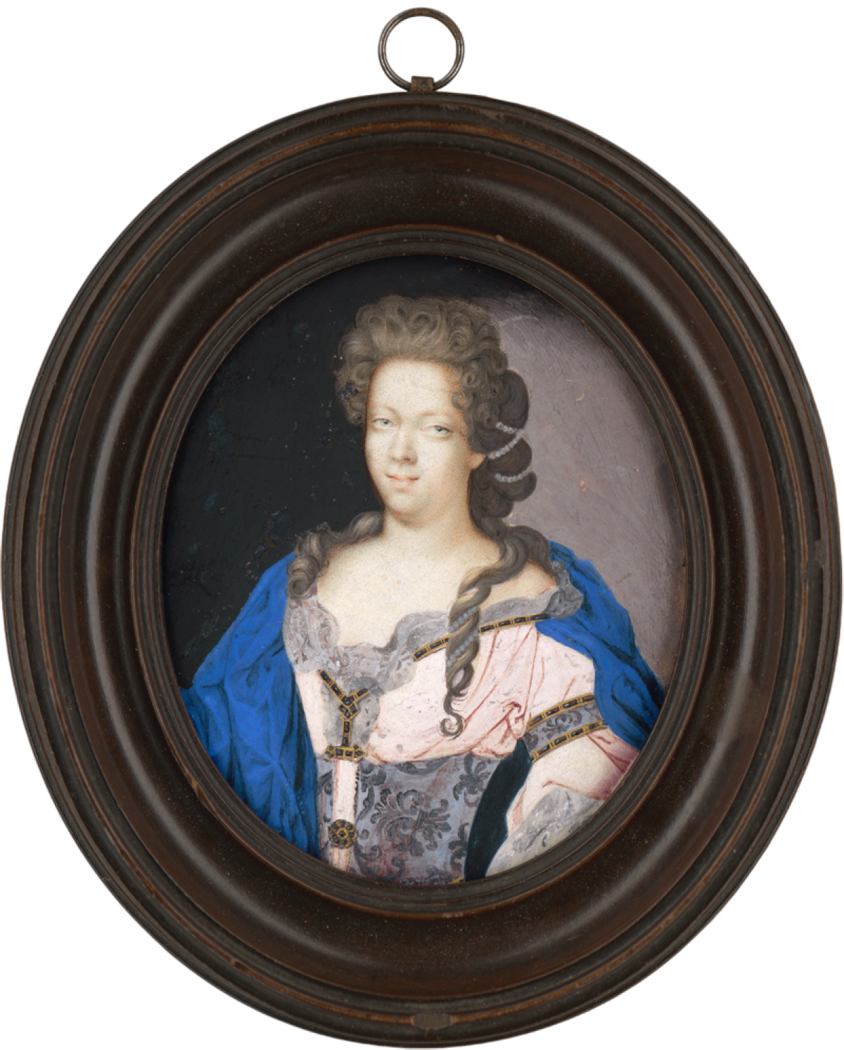Ein französischer Künstler hat diese adelige Dame im späten 17. Jahrhundert porträtiert. Sie schaut den Betrachter mit ernster Miene an. Zu dem hellblauen Kleid trägt sie einen rostroten Umhang mit Hermelinbesatz. Gehalten wird er durch eine Schmuckagraffe. Ihr dunkles, lockiges Haar ziert eine große Spange.