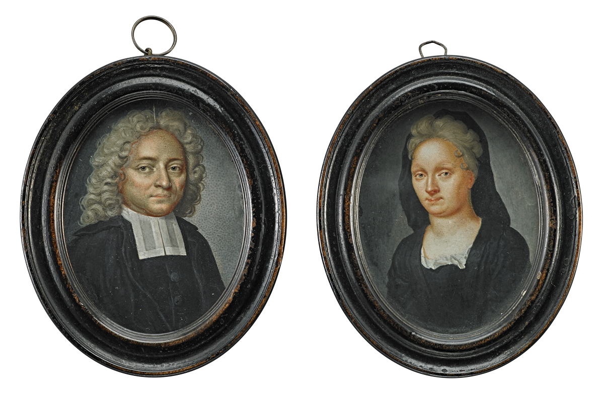 Dieses Ehepaar ist auf den rückseitigen Klebeetiketten identifiziert als Valentin Boegehold (1659 Kassel - 1721) und Anna Gertrud Boegehold, geb. Zoll (verh. 1690). Valentin Boegehold war Prediger in Waldau, Garnisonsprediger in Kassel und Lehrer am Collegium Carolinum. Gemalt wurden die beiden 1701 mit Wasserfarbe und Goauche auf Feinpergament. Höhe jeweils 59 mm