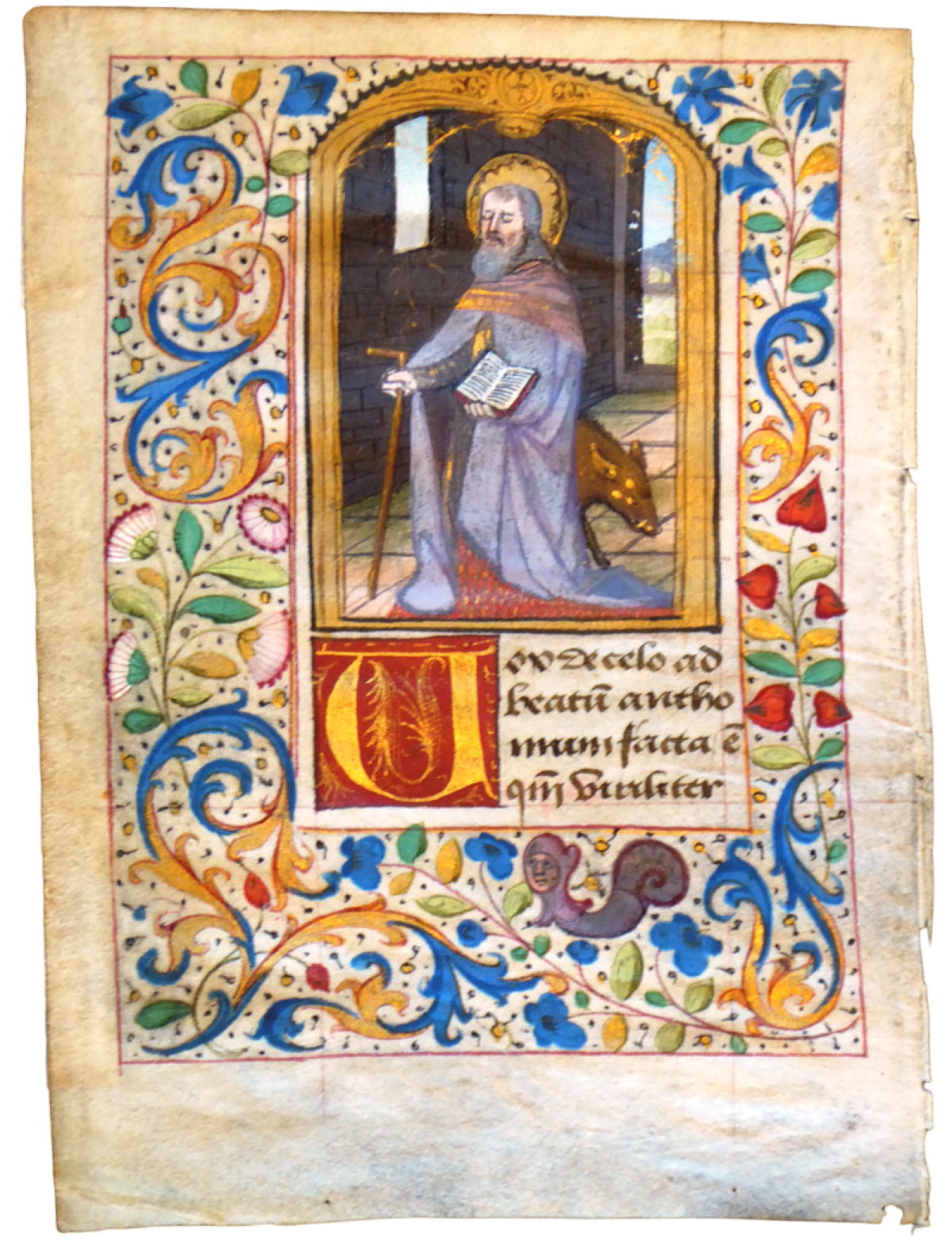 Einzelblatt eines Stundenbuches mit Schmuckinitiale und Bordüren; in der Mitte der Heilige Antonius.
