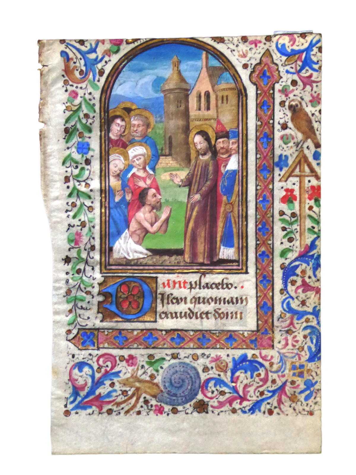 Einzelblatt eines spätmittelalterlichen Stundenbuches mit Schmuckinitiale und Bordüren; in der Mitte ist die Auferweckung des Lazarus dargestellt.