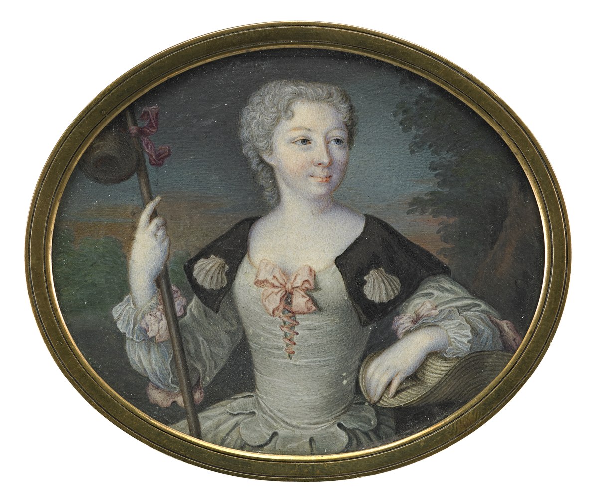 Diese Miniatur zeigt eine junge Frau in einem hellrosa Kleid mit hellgrauem Mieder, blauem Umhang und Perlen im Haar.
