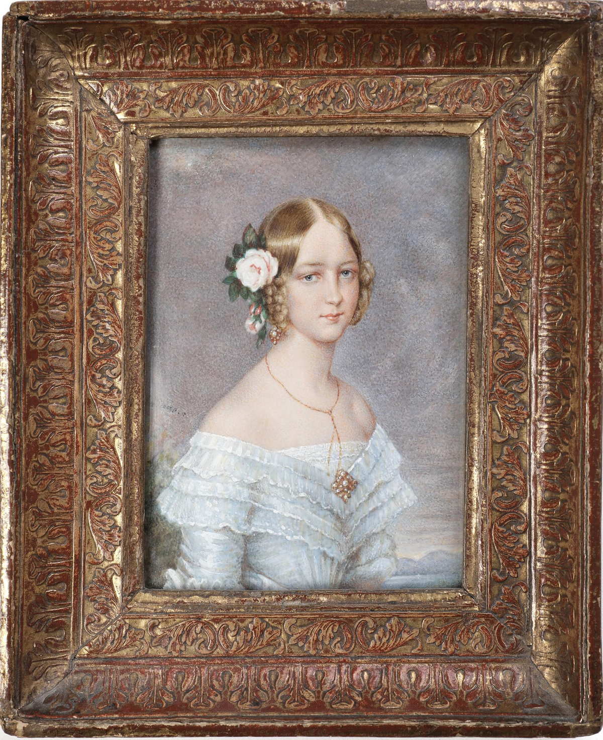 Junge Dame in weißem Kleid, Perlen- anhänger mit passenden Ohrringen und Rose im Haar; im Hintergrund ist eine Landschaft zu erkennen.
