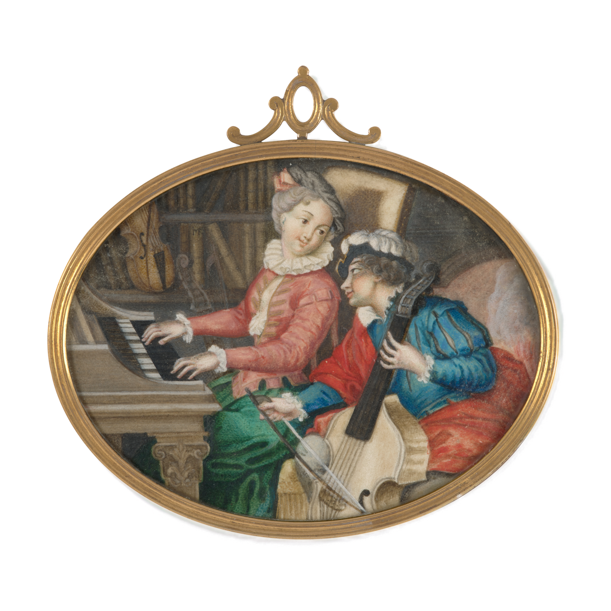 Ein verliebtes Pärchen spielt gemeinsam am Cembalo und an der Gambe. Im Hintergrund ist noch ein Cello vor einem Bücherregal zu sehen.